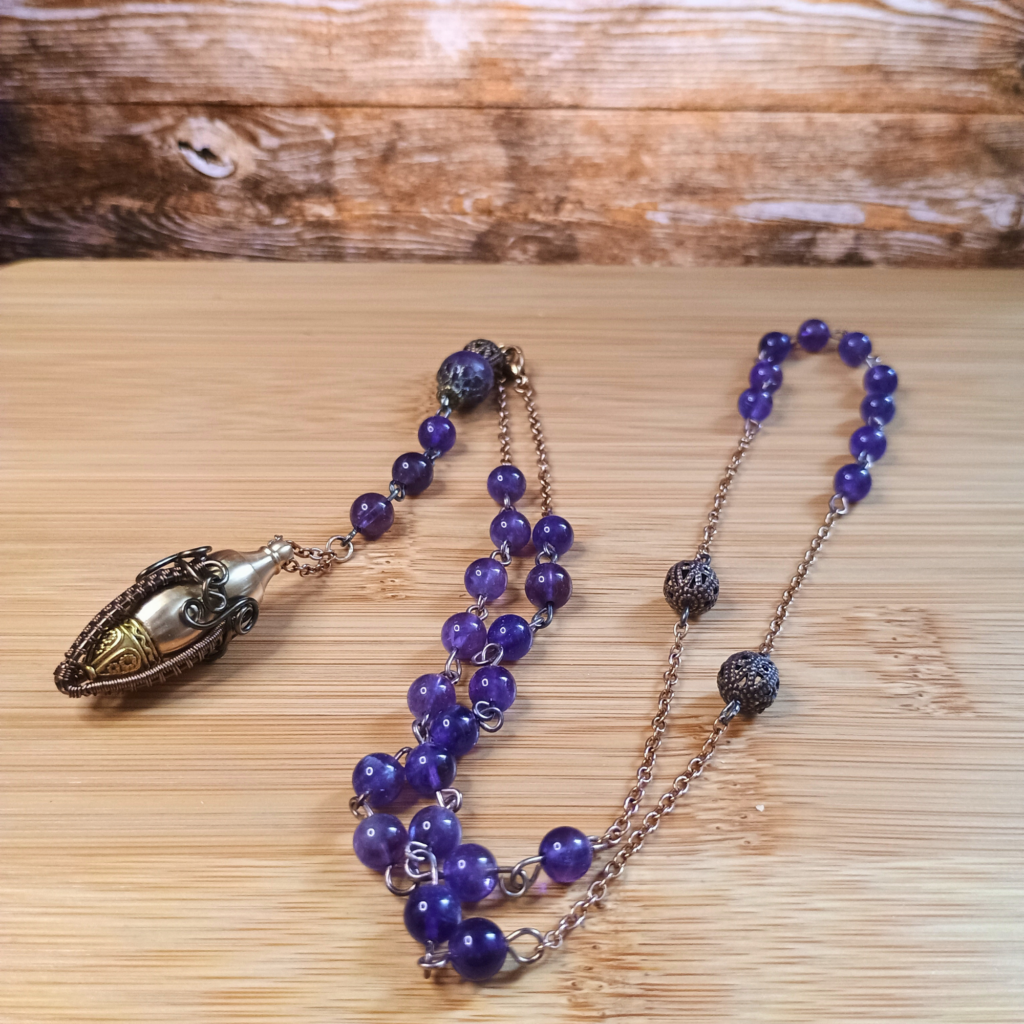 Le chapelet d’intention améthyste est un outil de dévotion pour soi, qui permet de travailler sur la sagesse, la créativité ou la force intérieure en aidant à gérer sa colère par exemple. Il est composé sur un travail de matière, taille et perles de 3,6,9. La fiole en laiton vous permettra de déposer un souhait, un témoin, ce qui vous servira le plus dans votre accompagnement et que vous pourrez porter sur vous ou près de vous selon votre rituel et vos envies.