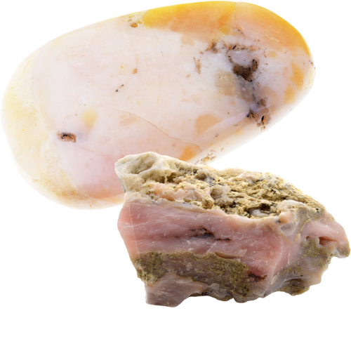 L’opale commune qu’on trouve donc souvent sous le nom d’opale du Pérou ou opale des Andes est une opale manganésifère donc qui contient minerai, oxyde, sel de manganèse, c’est ce qui modifiera son aspect blanc laiteux à une pierre rosée avec des nuances parfois rouille qui s’apparentent à de l’oxydation.