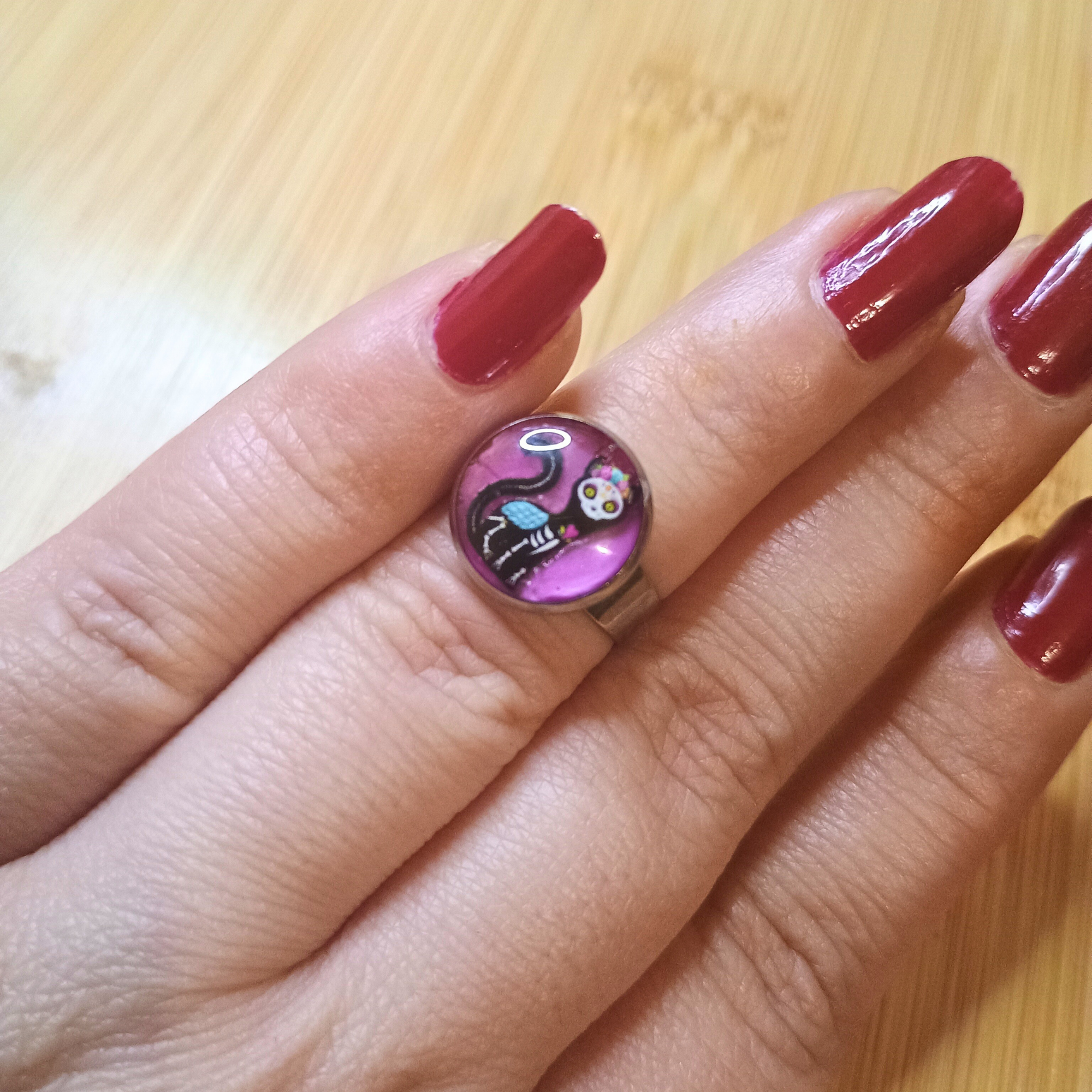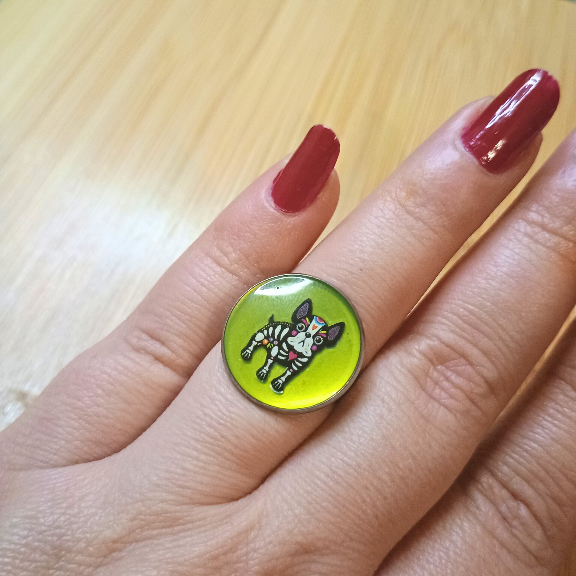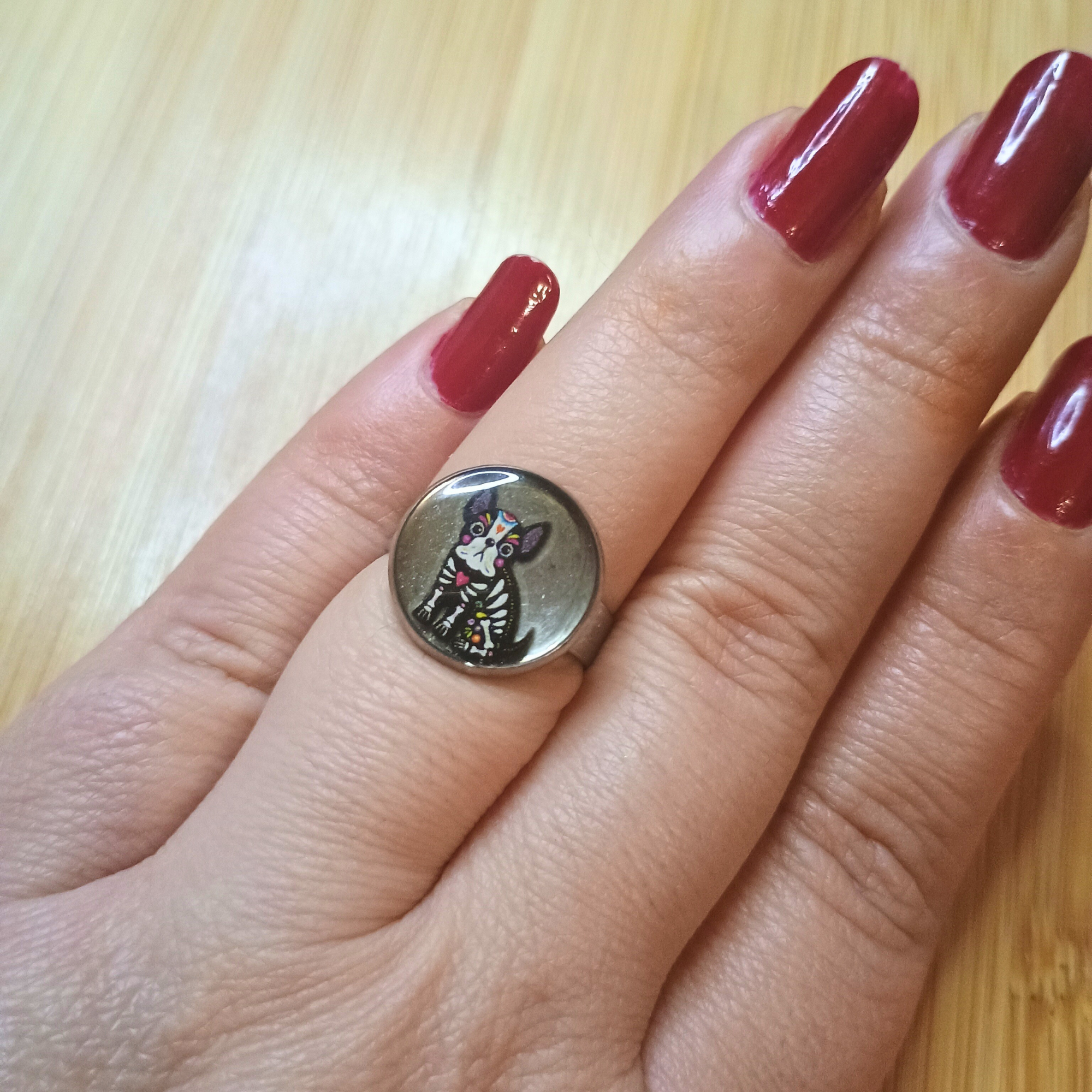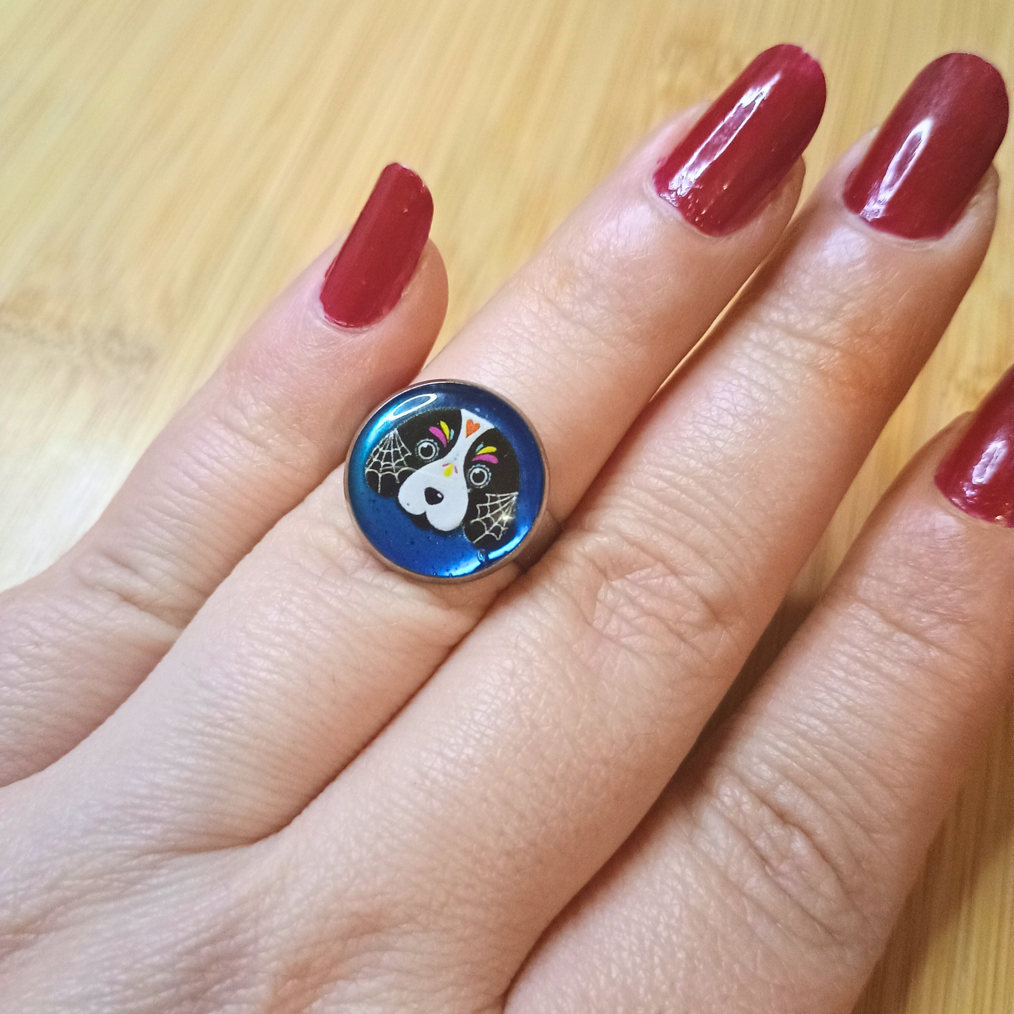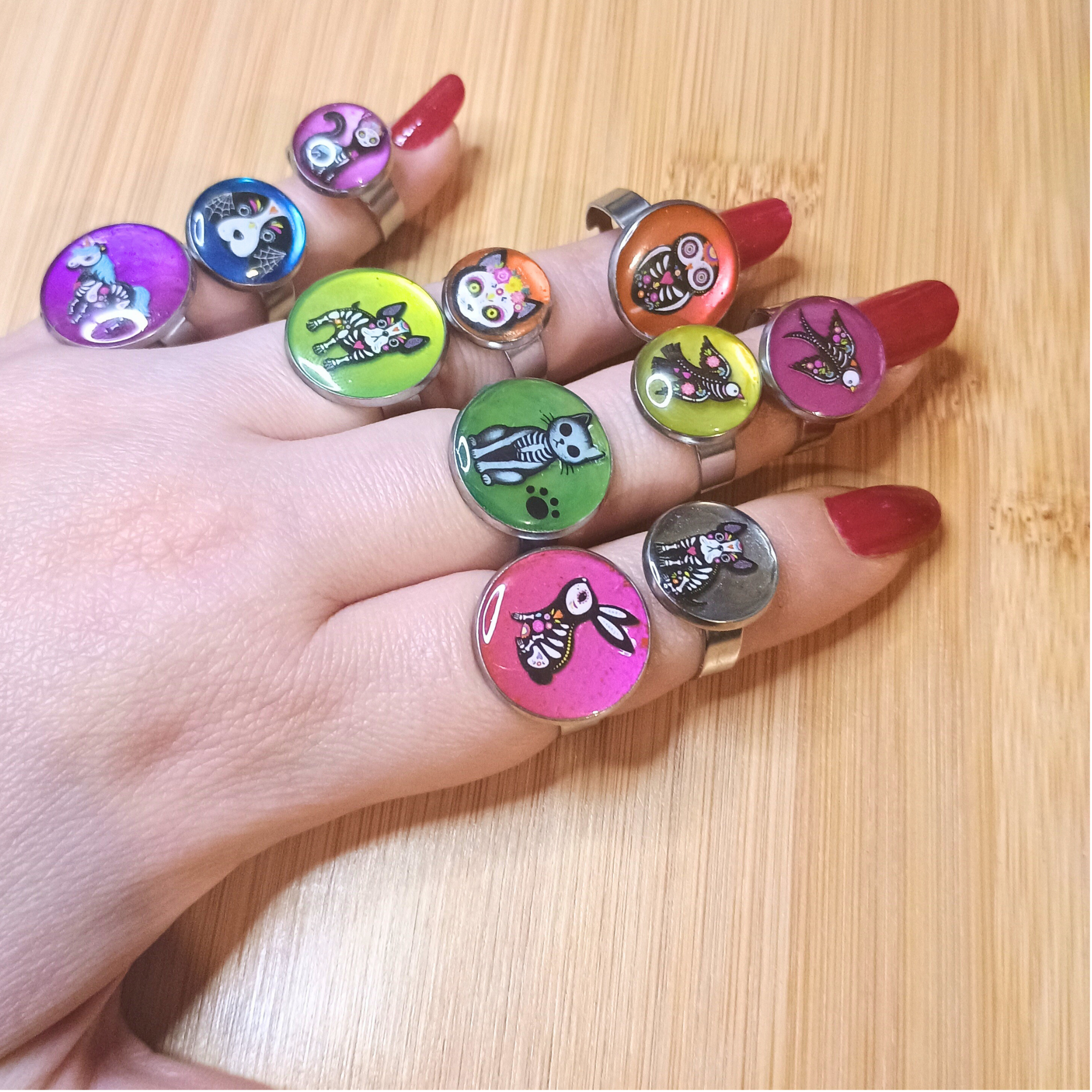 Bagues réglables acier, résine et motif Aninaux Dia de los Muertos