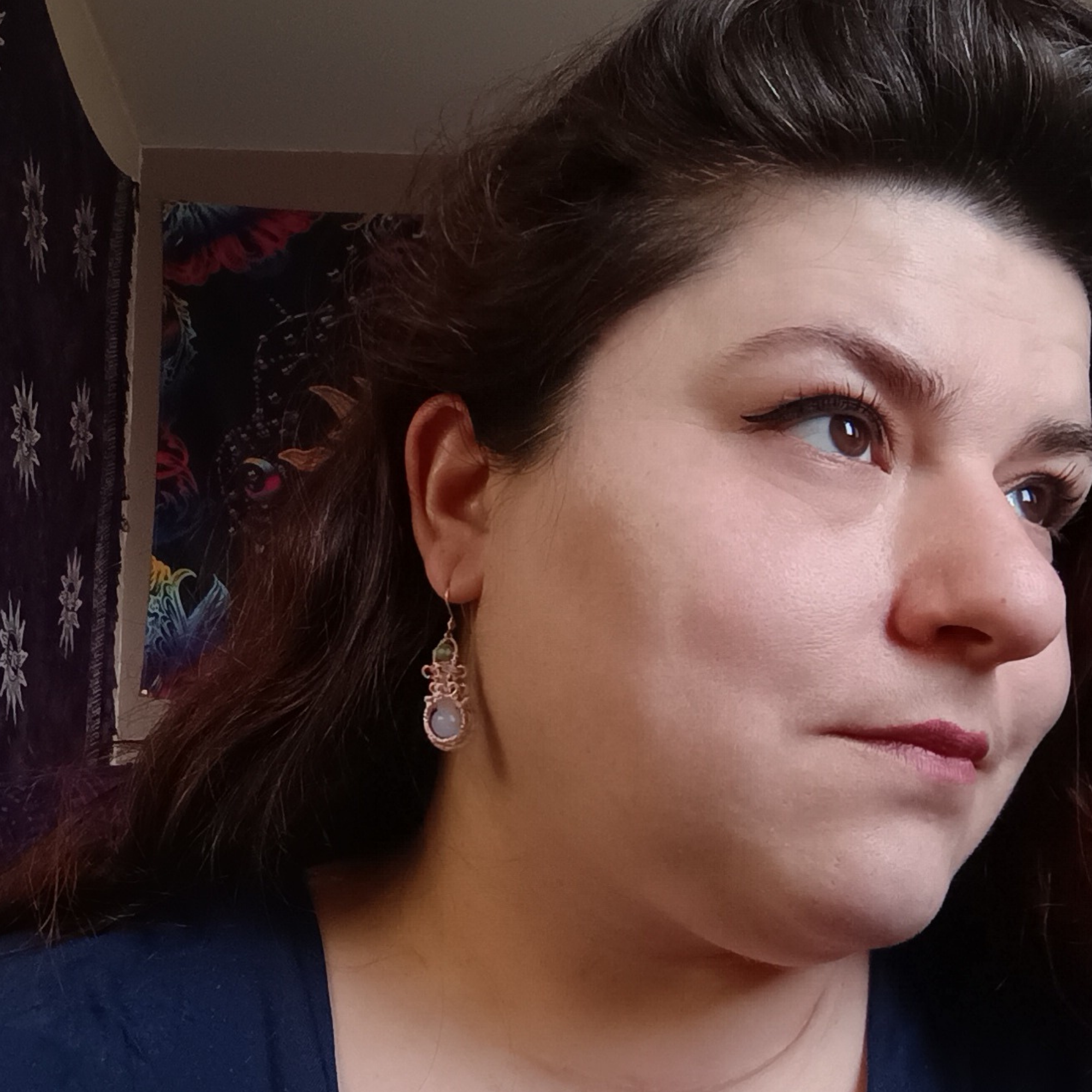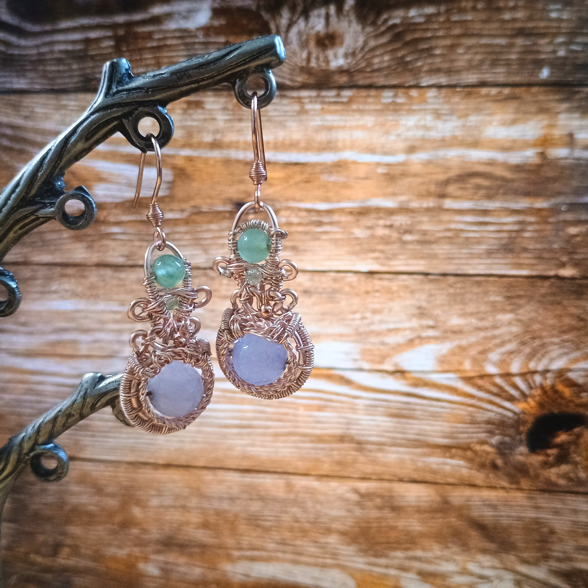 Boucles d’oreille torsadée cuivre or rose et perles de chrysoprase et celestine.