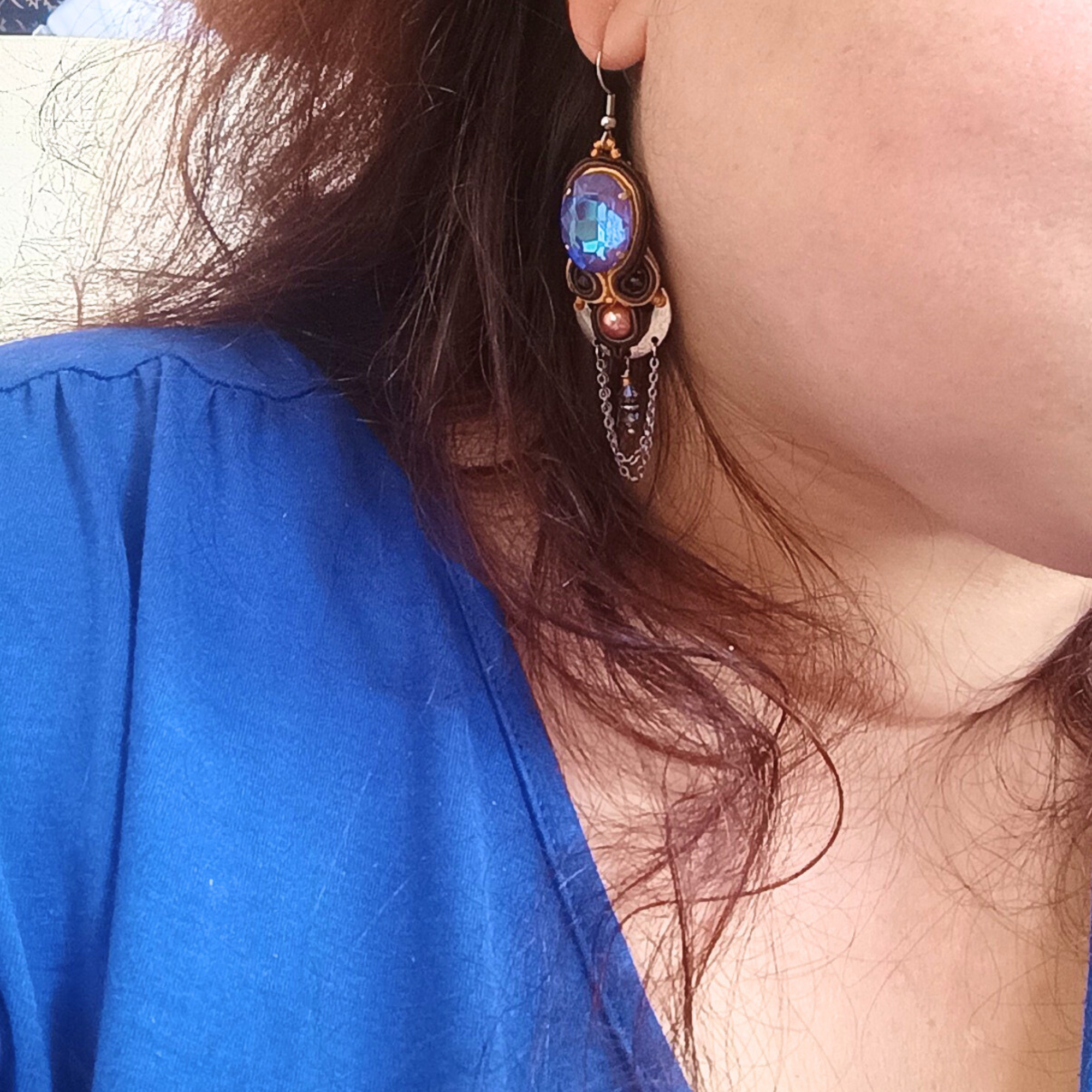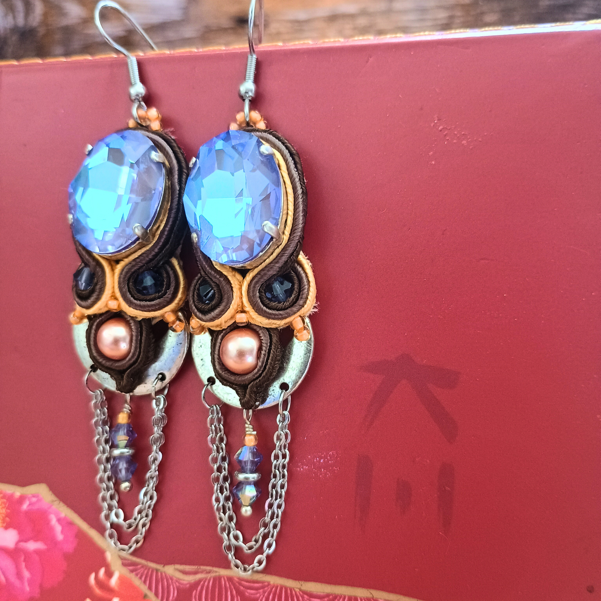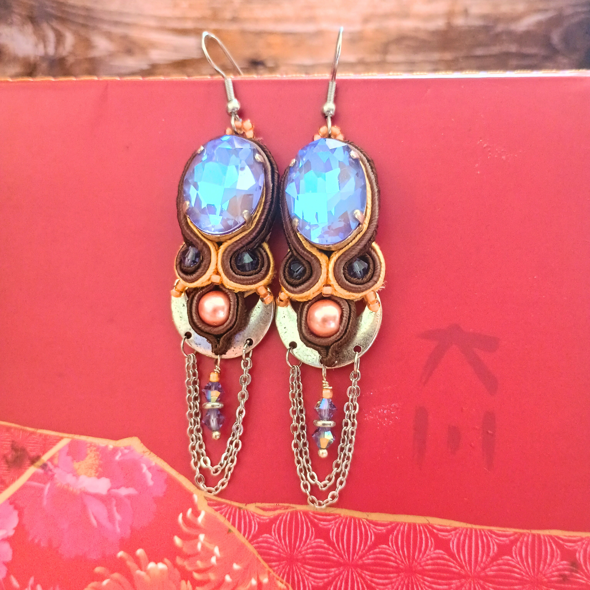 Boucles d’oreilles en soutache chocolat mandarine, cristal lila et chaines. Sayan