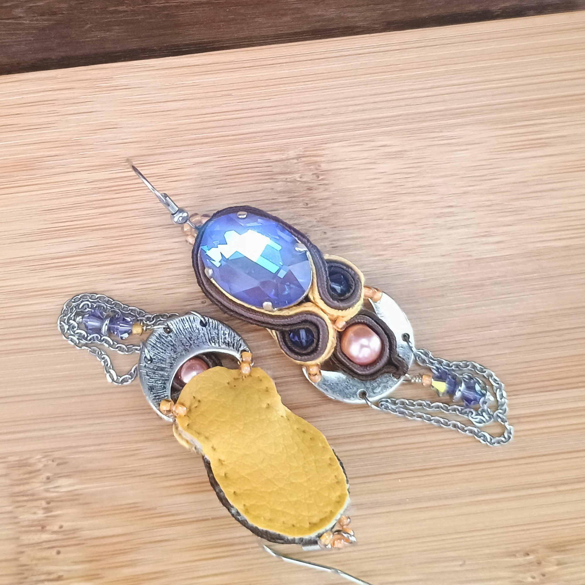 Composition : Soutache, simili cuir jaune, chaine acier, estampe laiton, perles de cire, toupies et cabochon en cristal autrichien, attache acier.