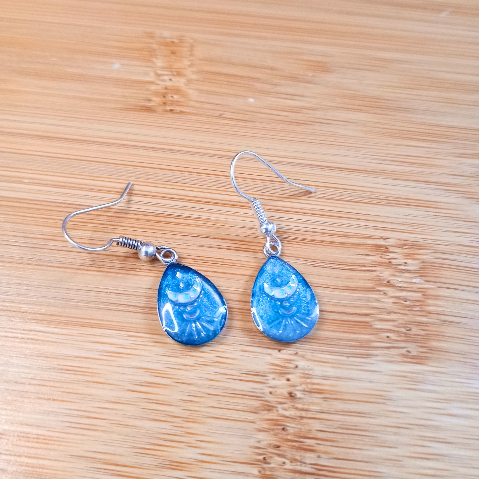Boucles d’oreilles pendantes goutte support acier résine, fantaisie bleue
