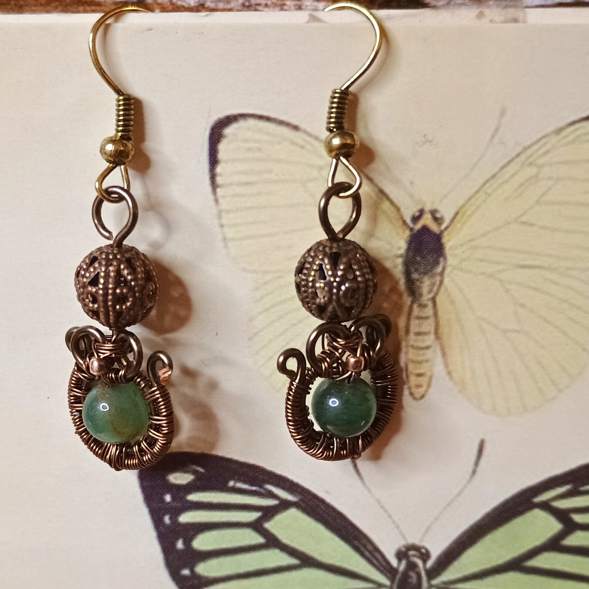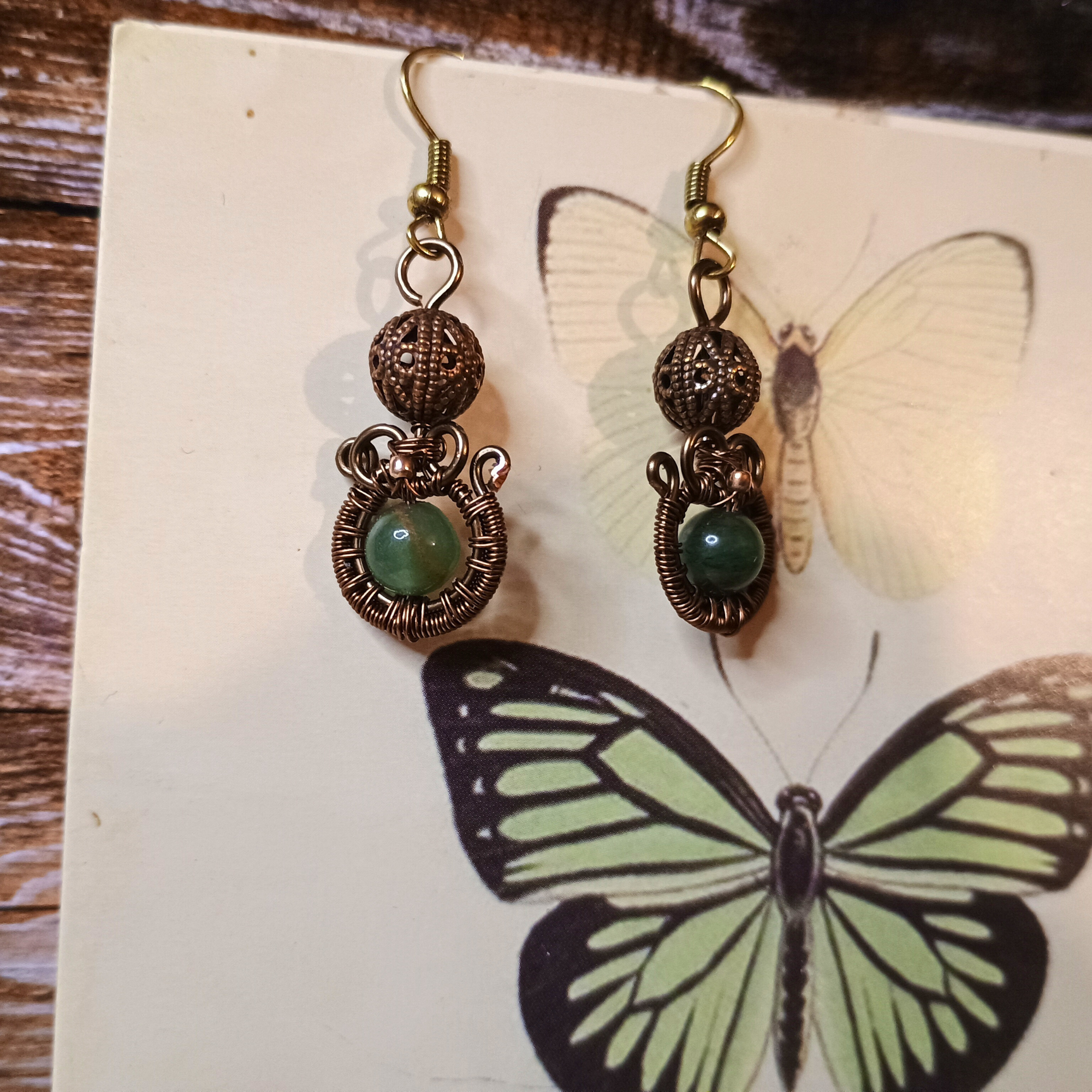 Boucles d’oreilles wire-wrapping cuivre couleur bronze et perles d’aventurine verte