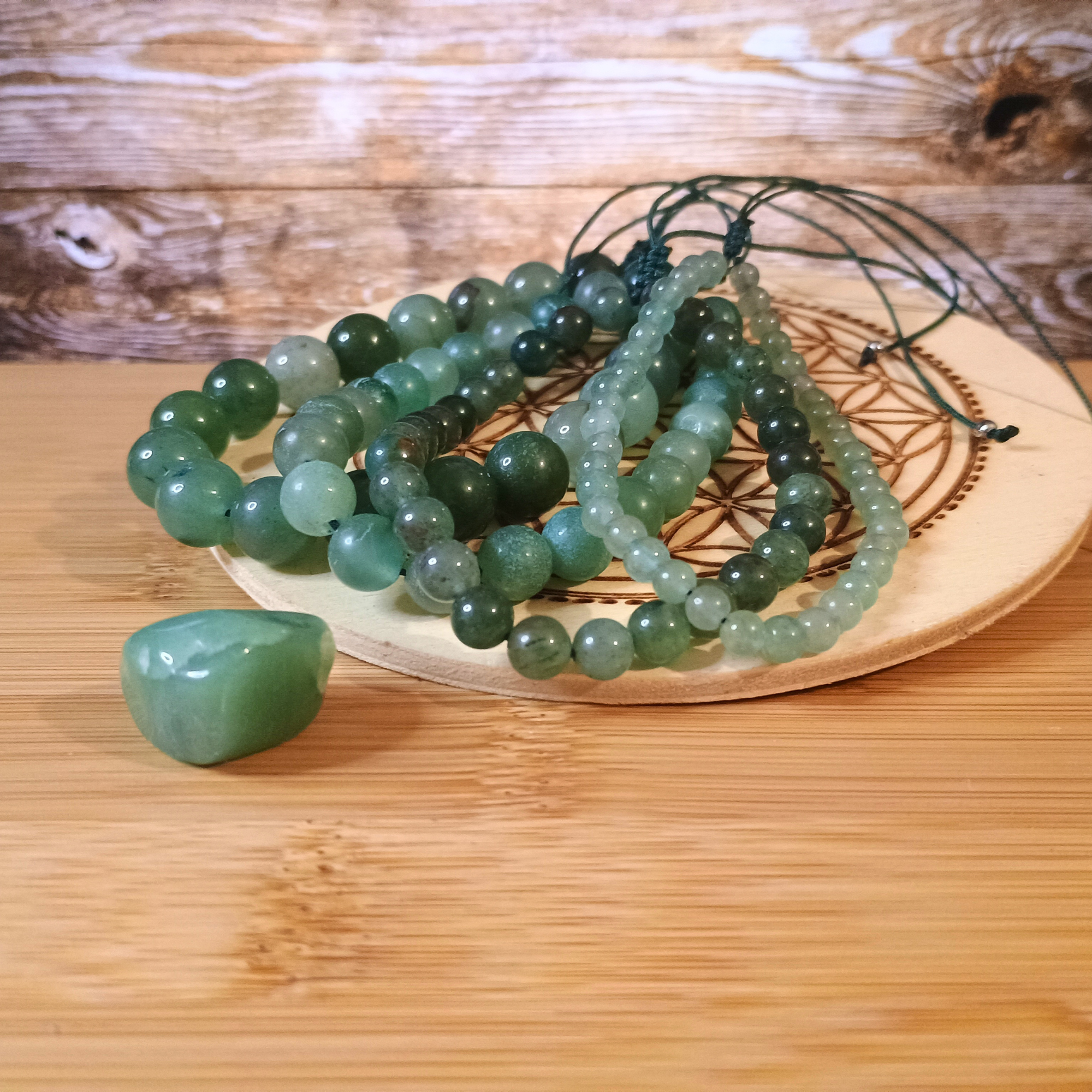Composition : Fil de jade (nylon tressé), perles aventurine verte (4,6,8, 10 mm), acier