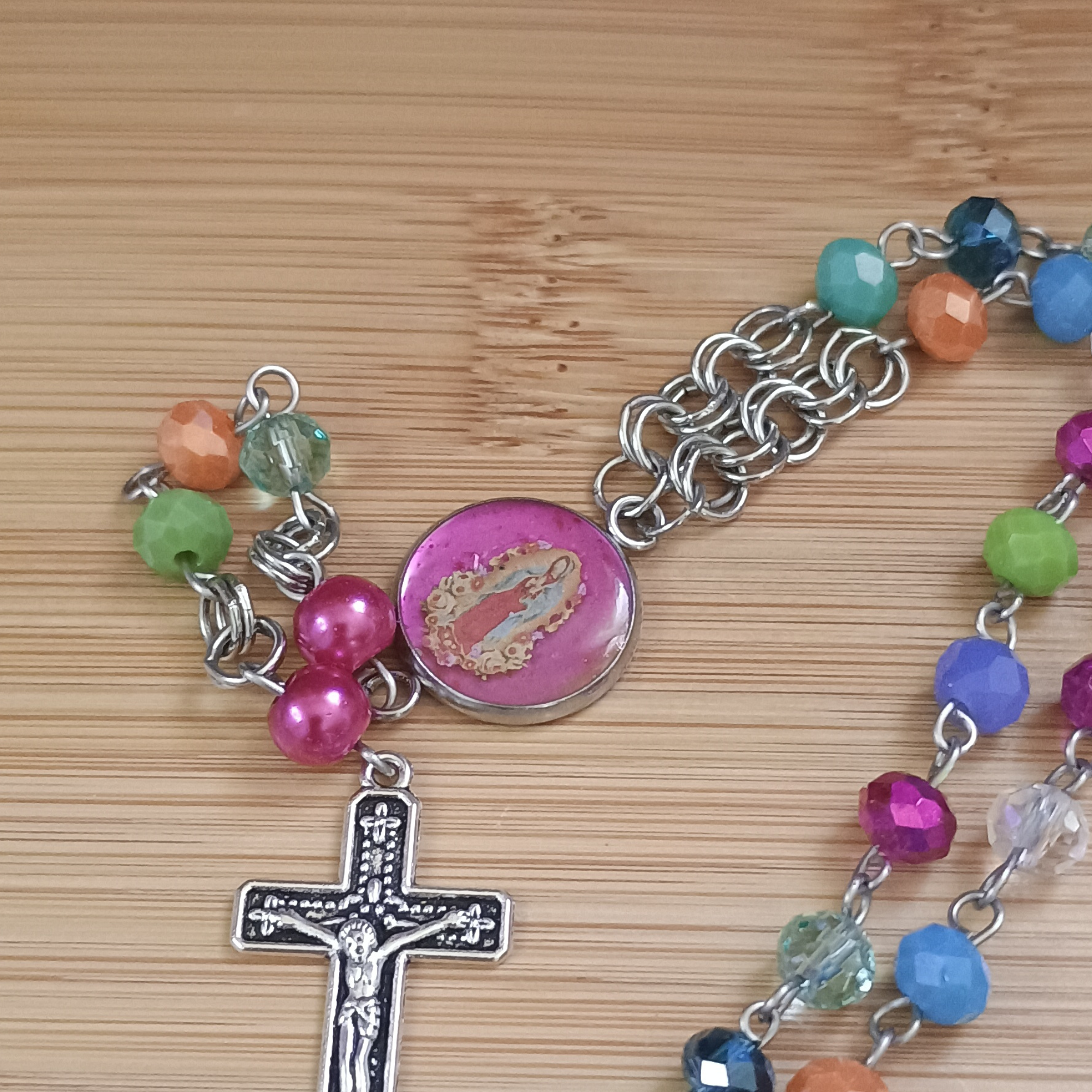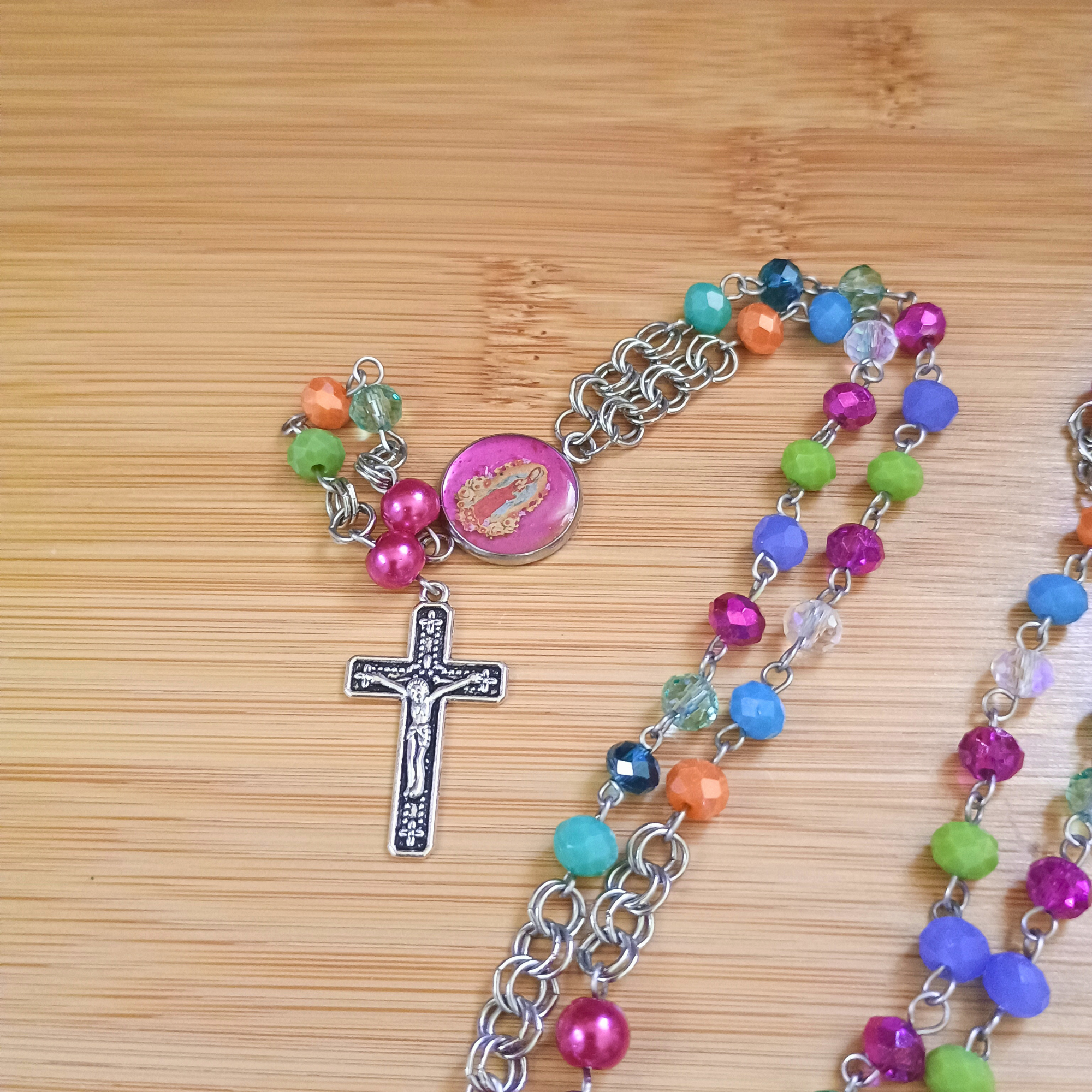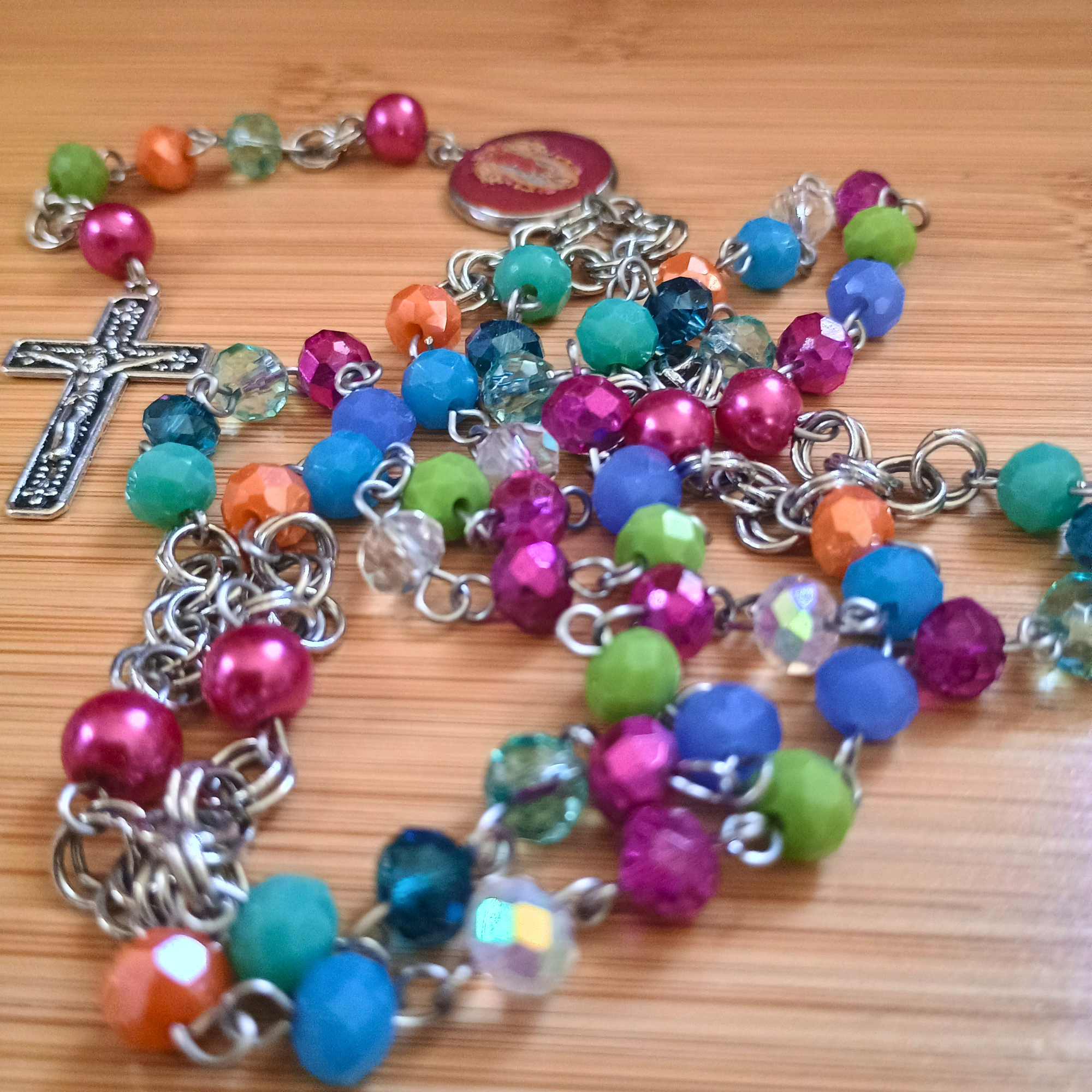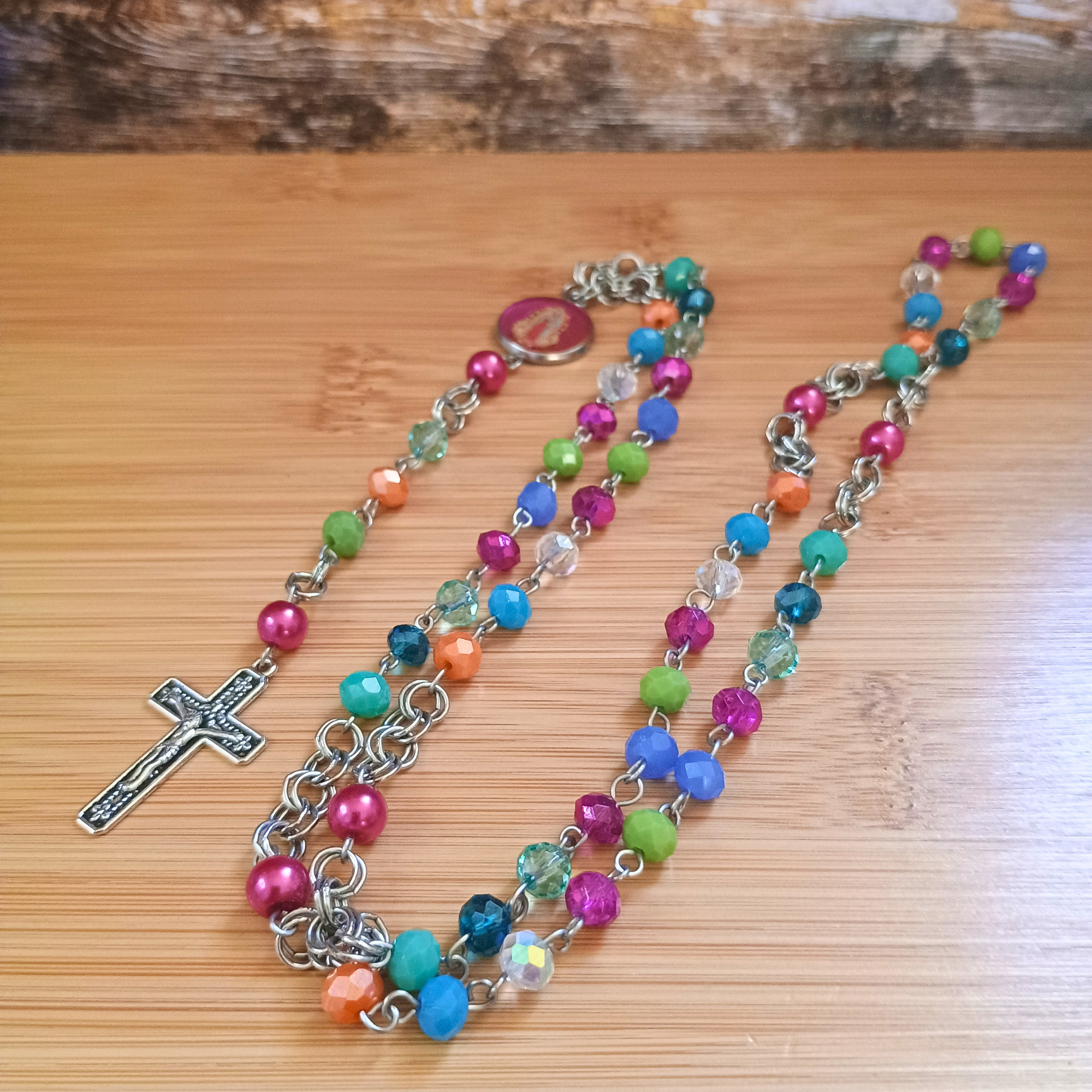 Composition : perles facette verre, tige acier, médaille acier et résine, croix laiton