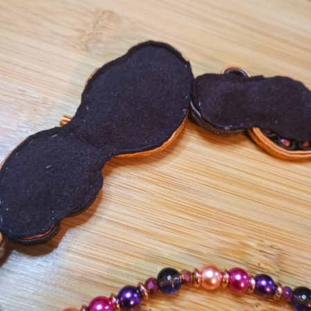 Composition : soutache, suédine, perles de verre, perles acrylique.