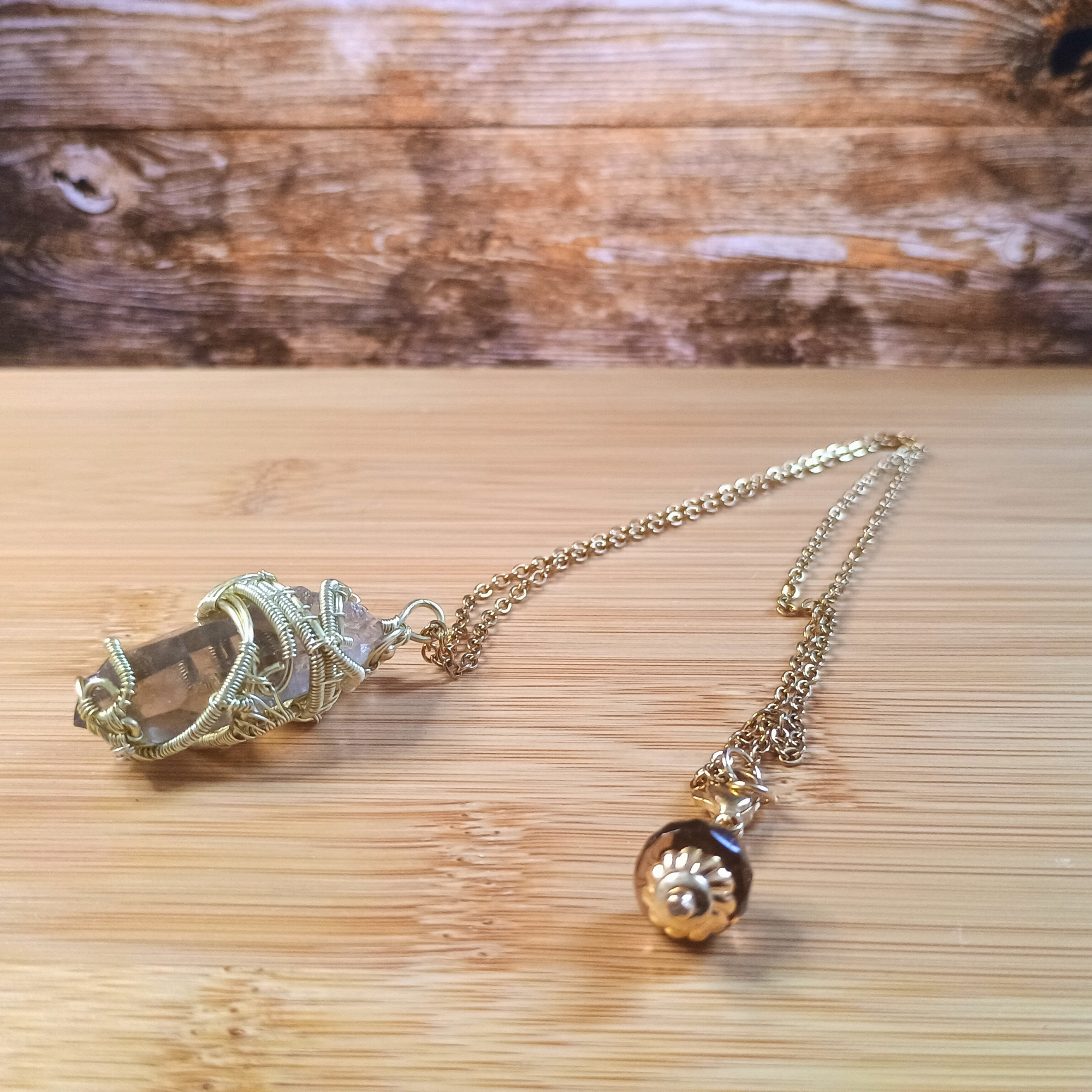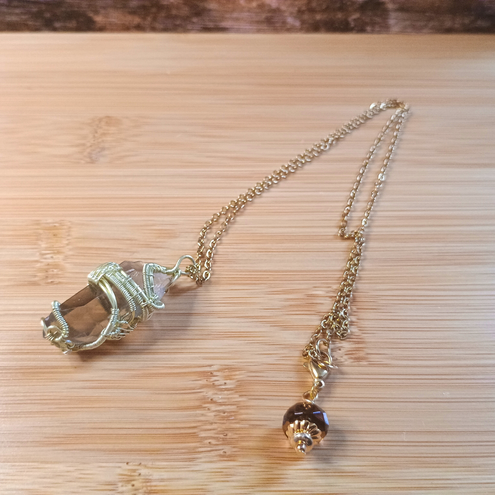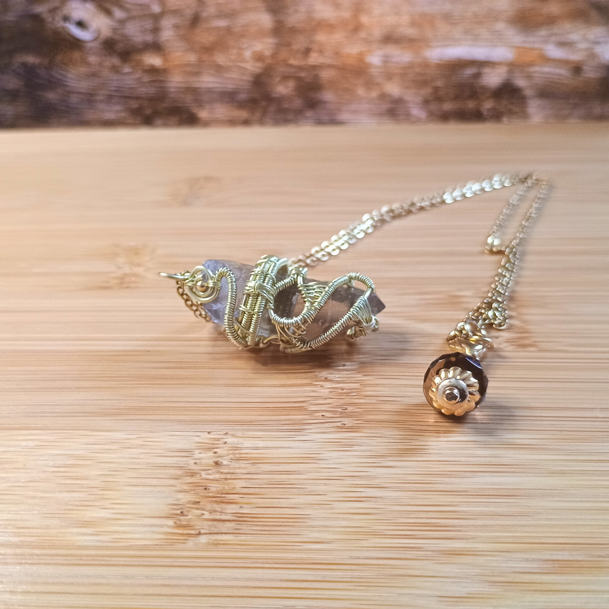 Composition :fil de cuivre doré, chaine acier, pointe de quartz fumé