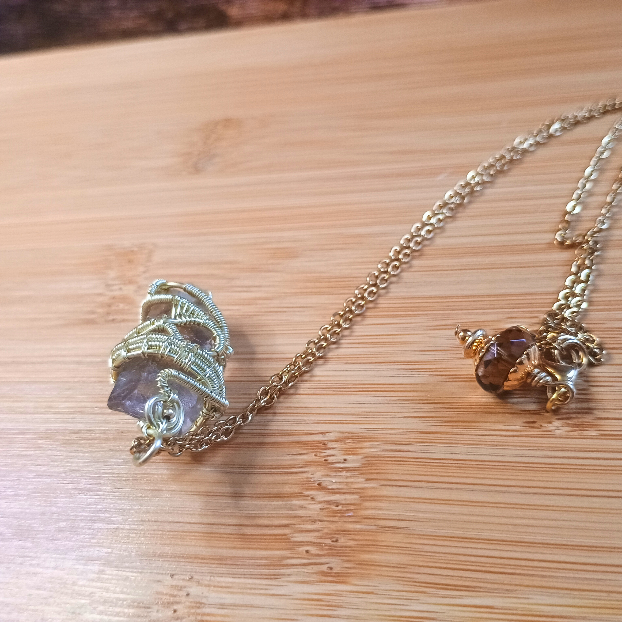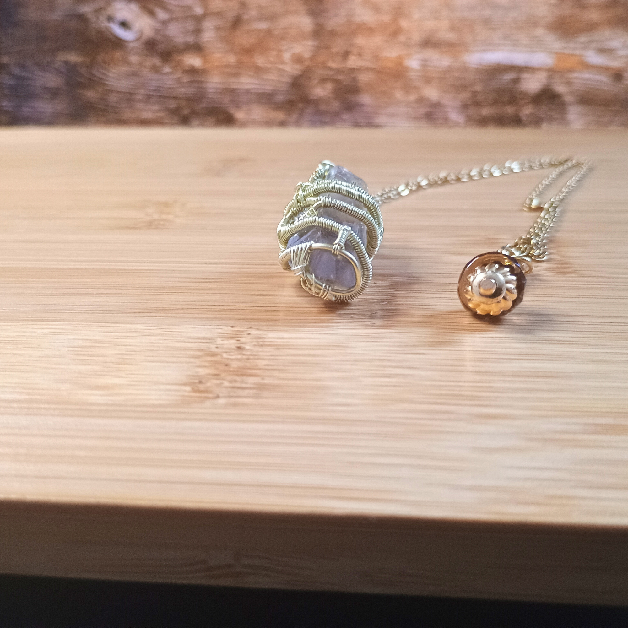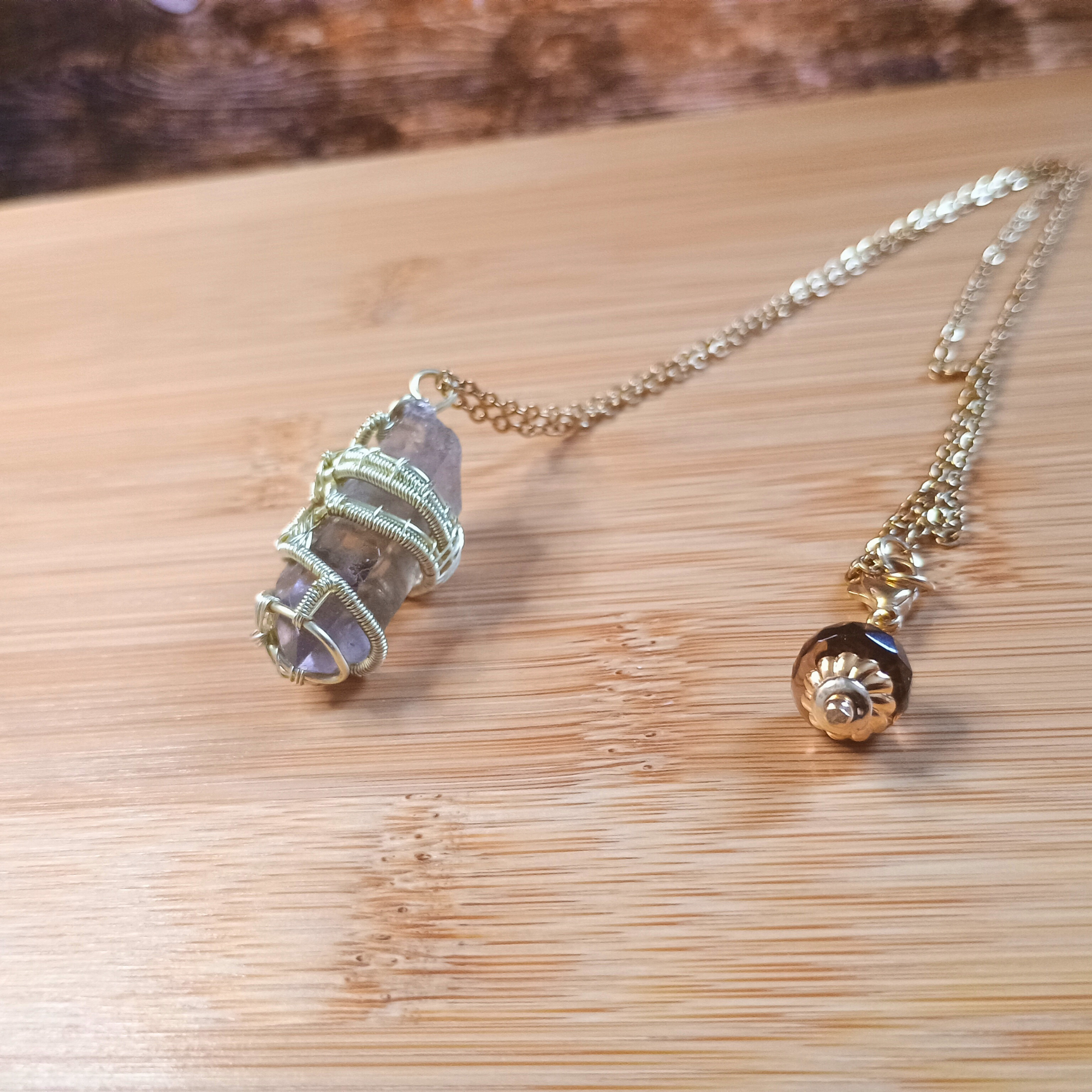 Composition :fil de cuivre doré, chaine acier, pointe de quartz fumé