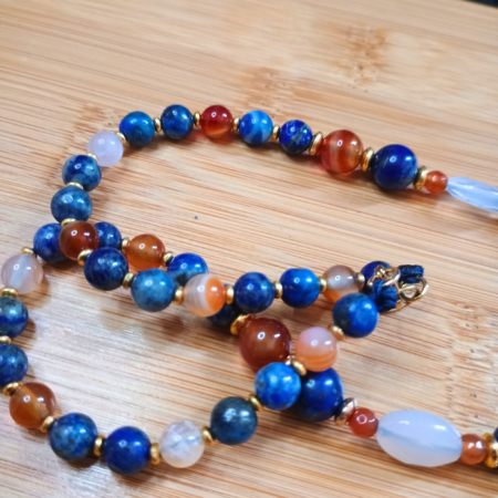 Composition : cuivre doré, perles naturelles lapis lazuli, chrysocolle, cornaline, fil polyester, apprêts acier.