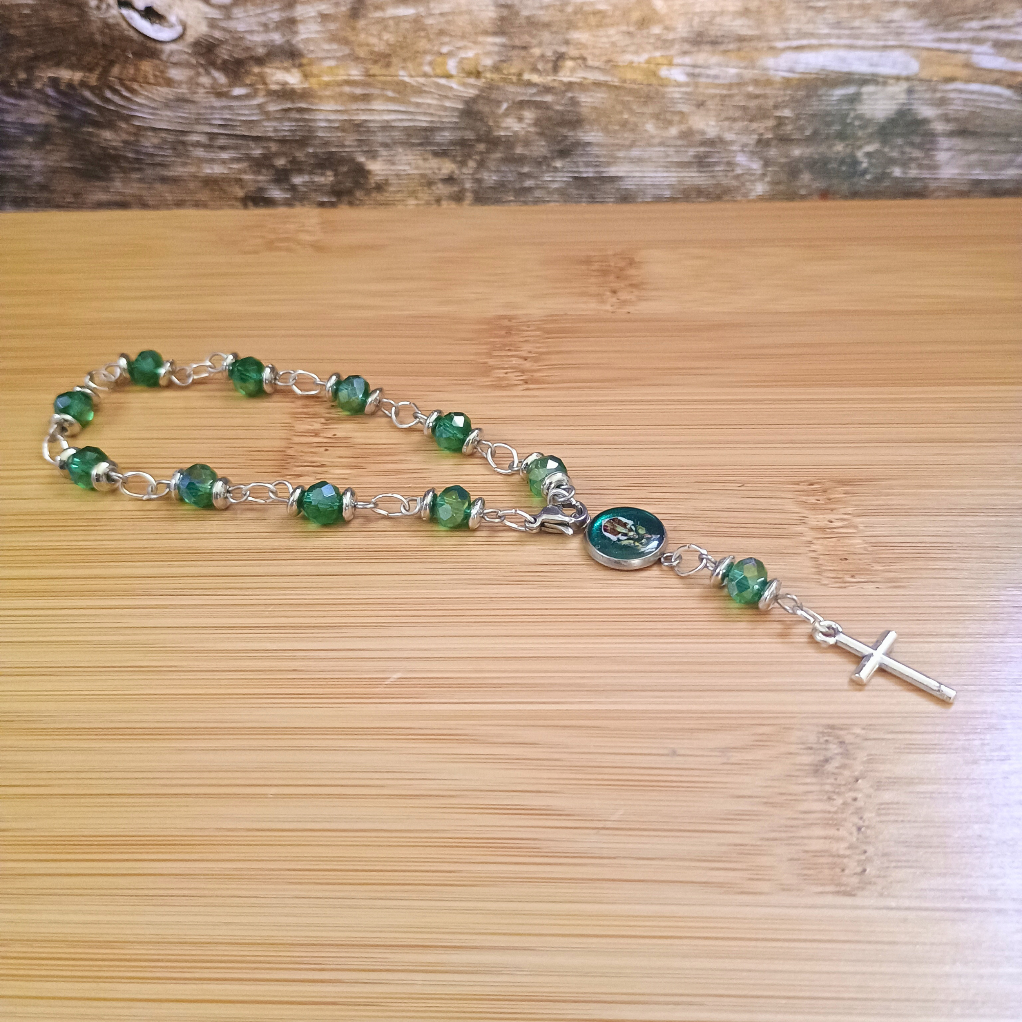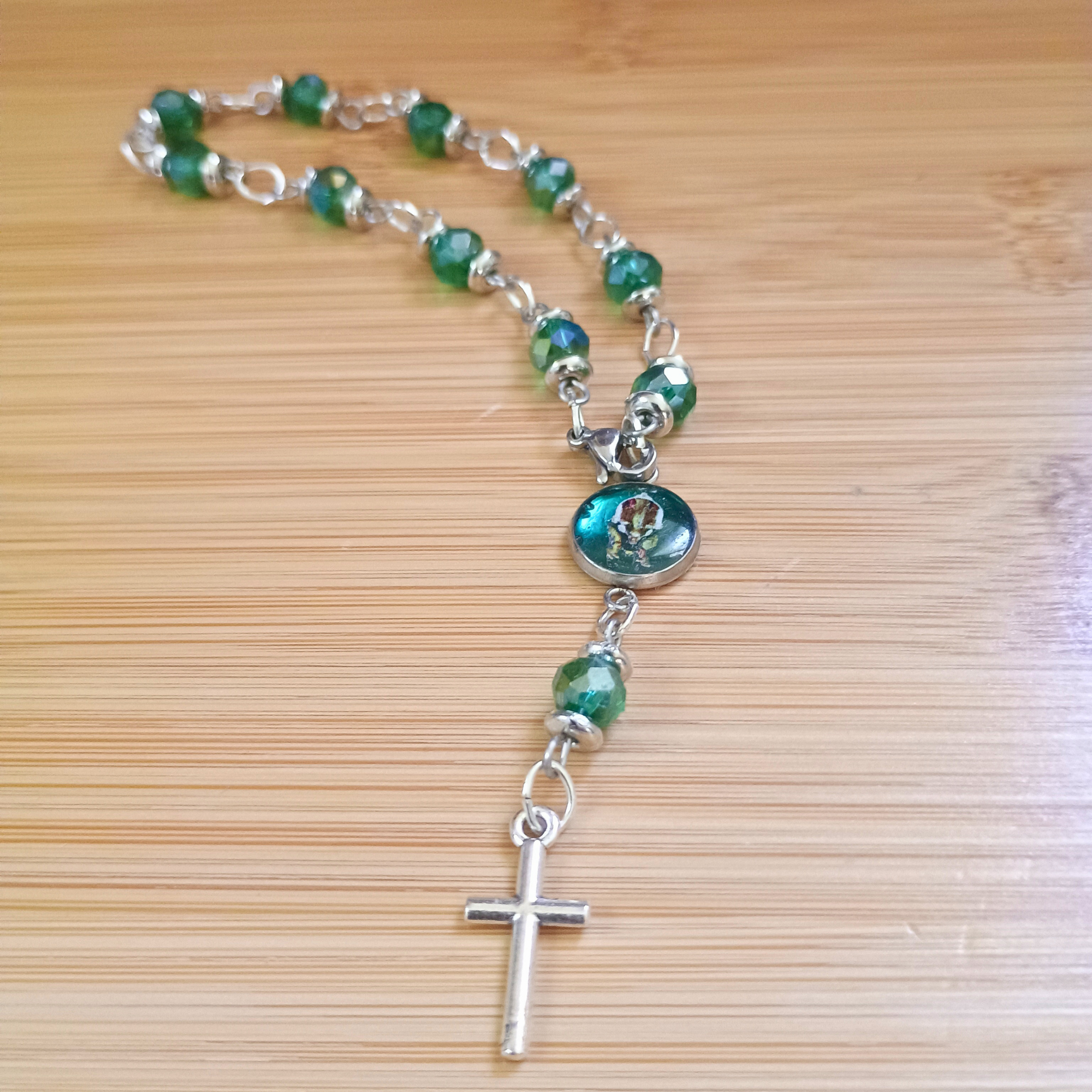 Réf. Dizainier perles facette vertes médaille vierge et croix argentée Catégories ,