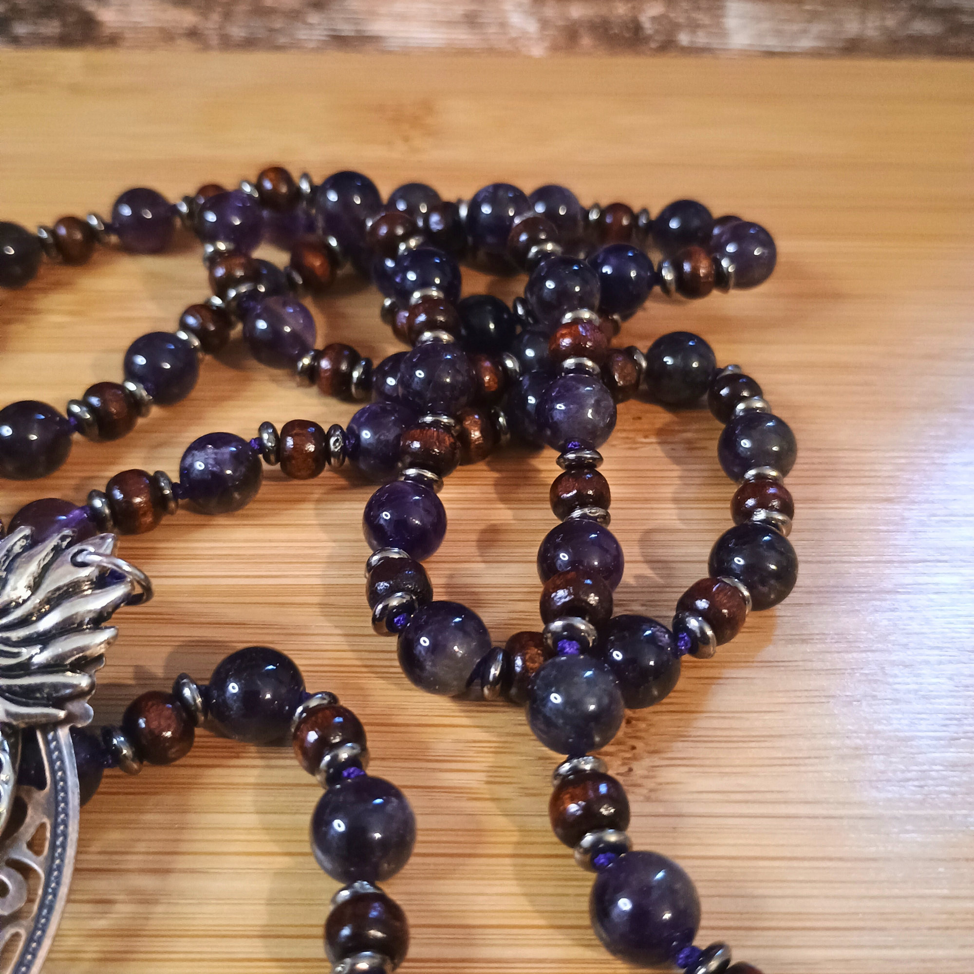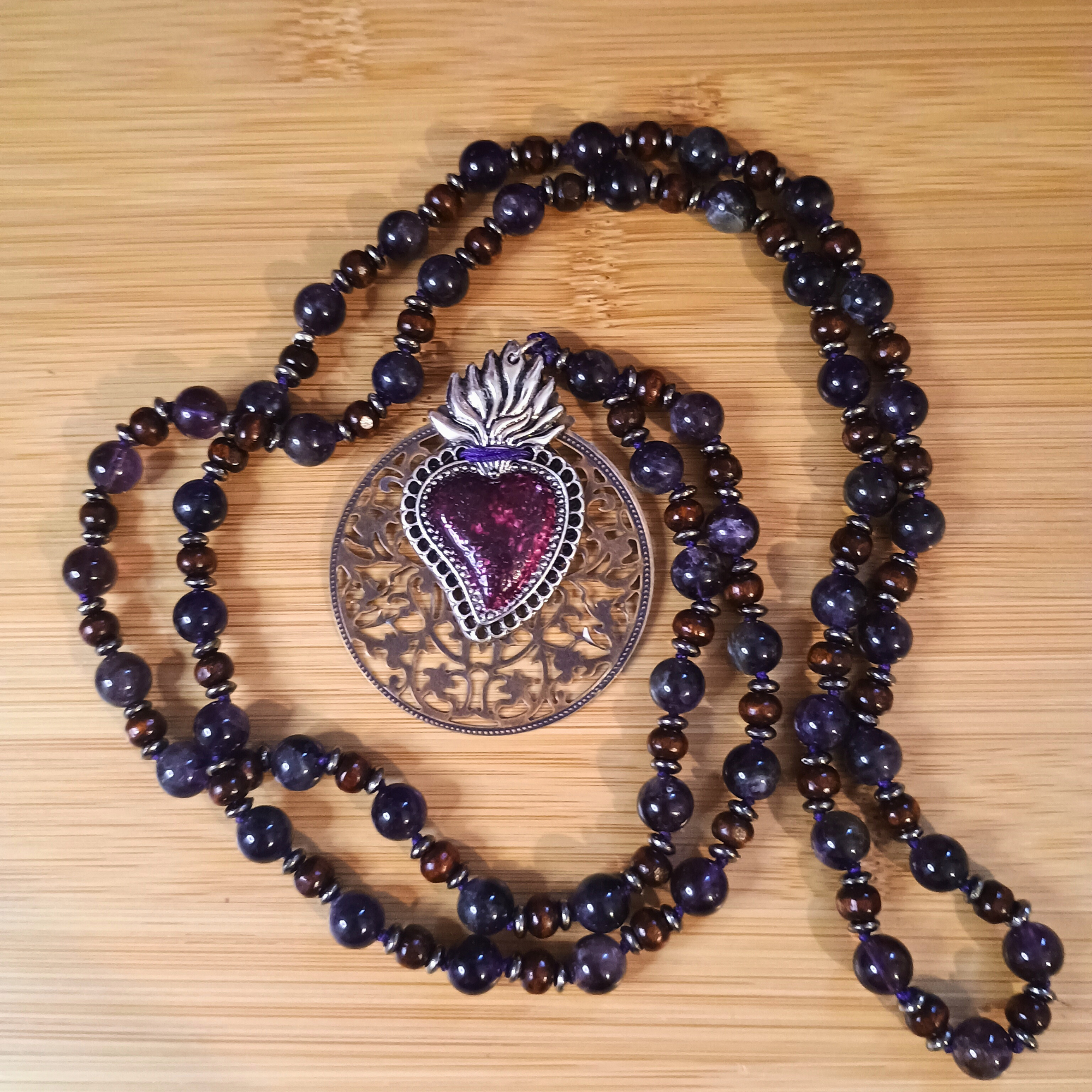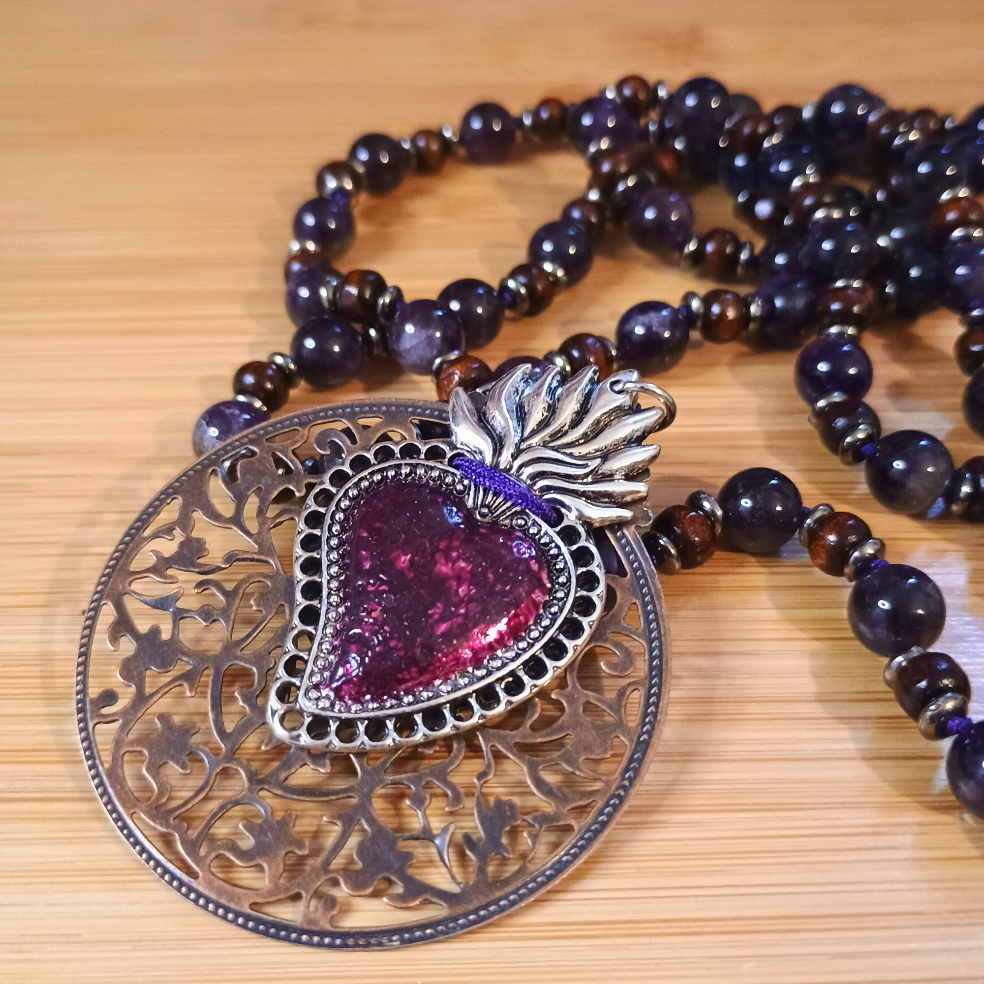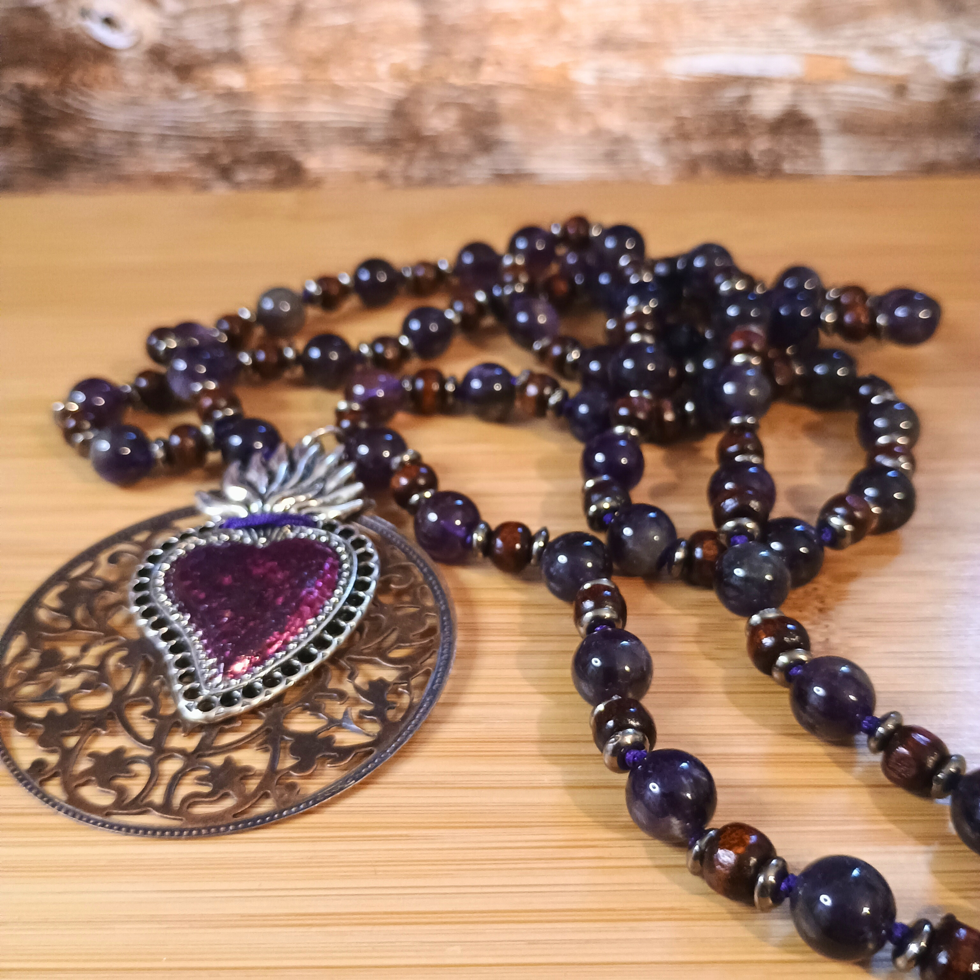 Réf. Mala perles de bois et Améthyste Foncée et ex-voto coeur sacré Catégories , , , , , , ,