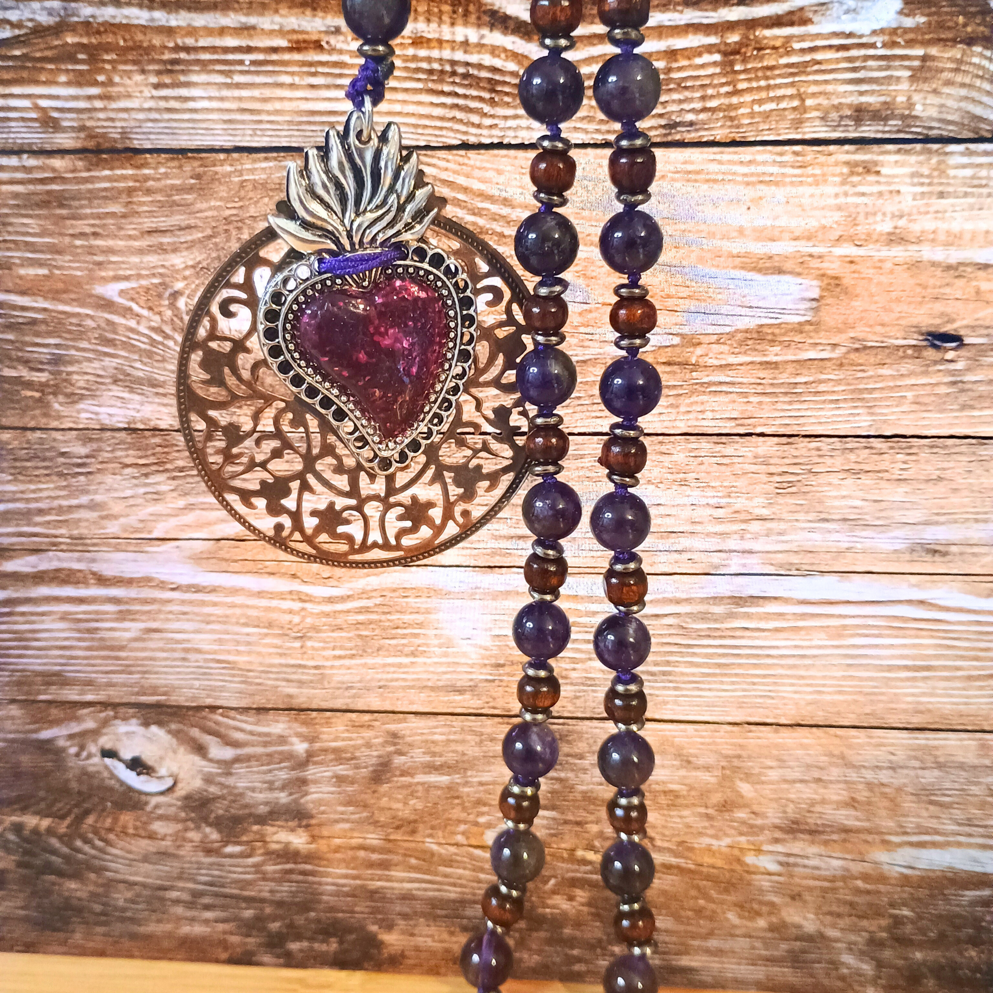 Mala perles de bois et Améthyste Foncée et ex-voto coeur sacré