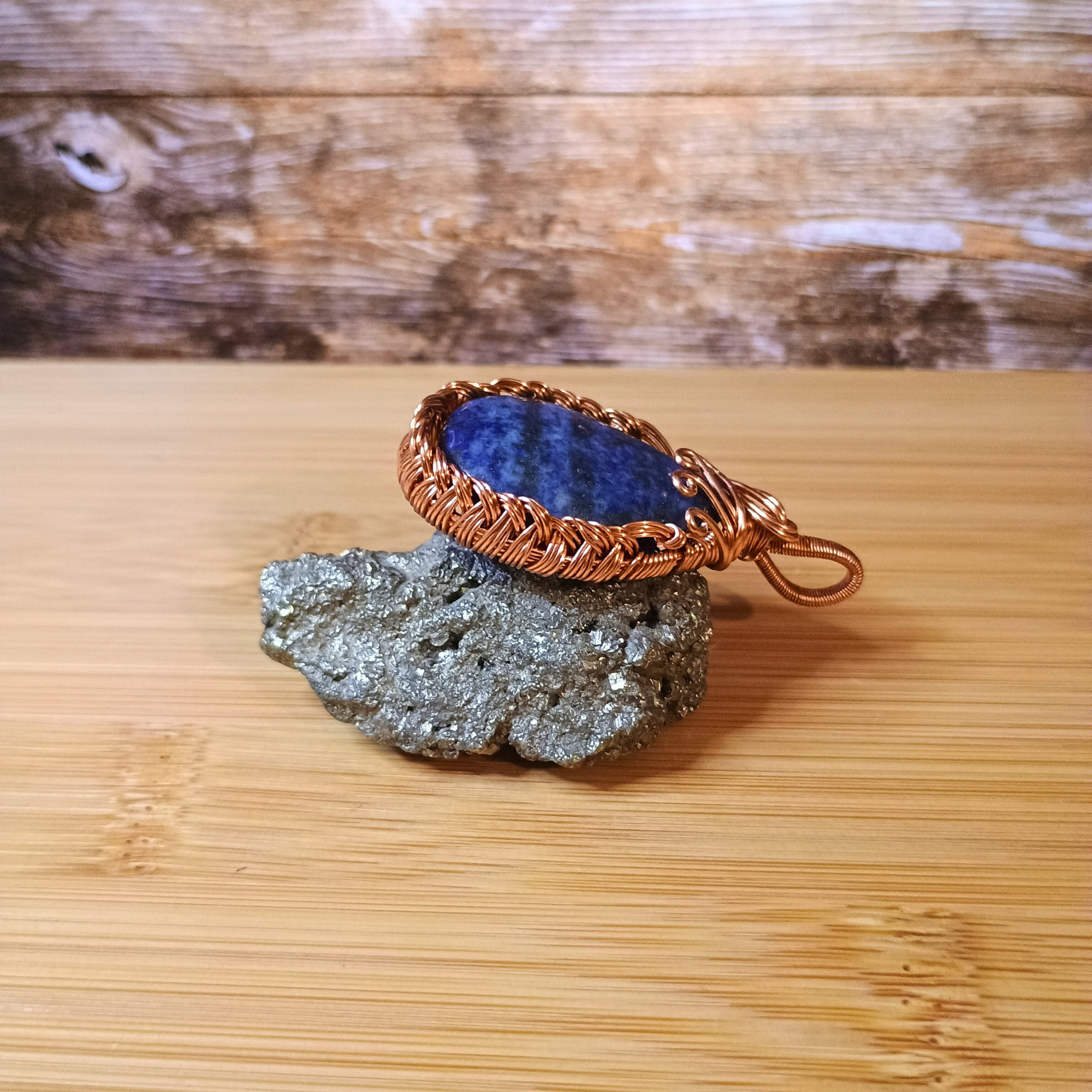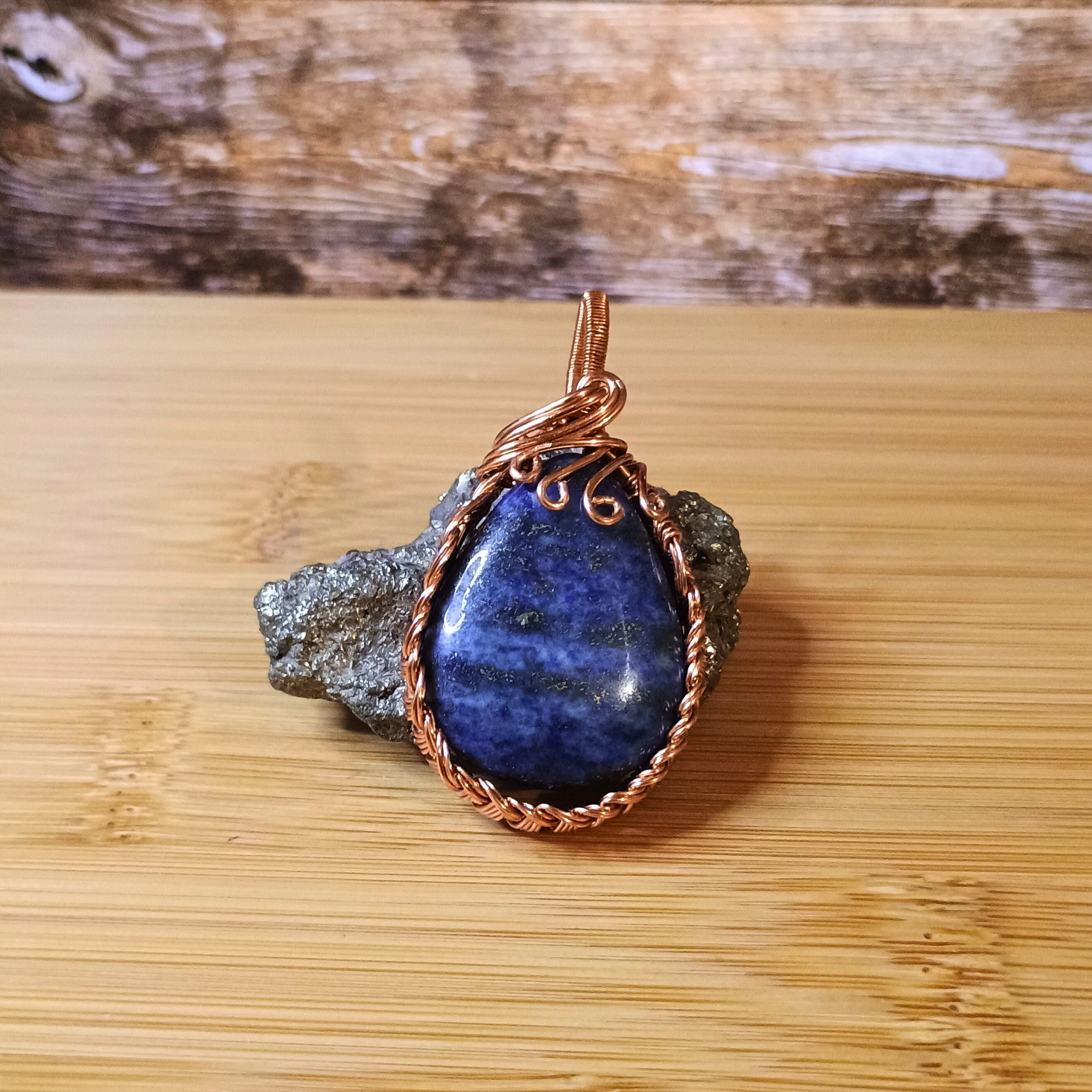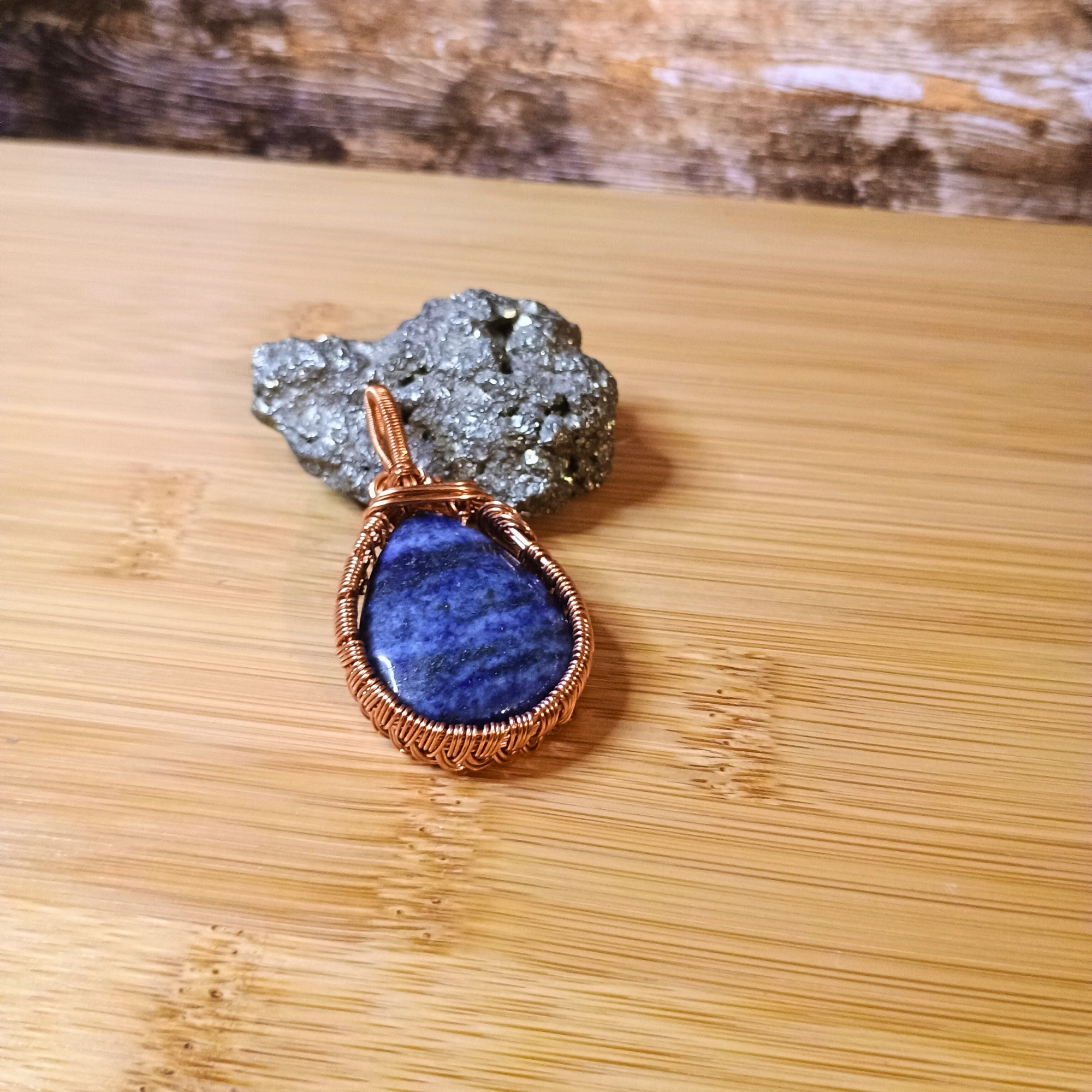 Composition fil de cuivre, perle goutte lapis-lazuli