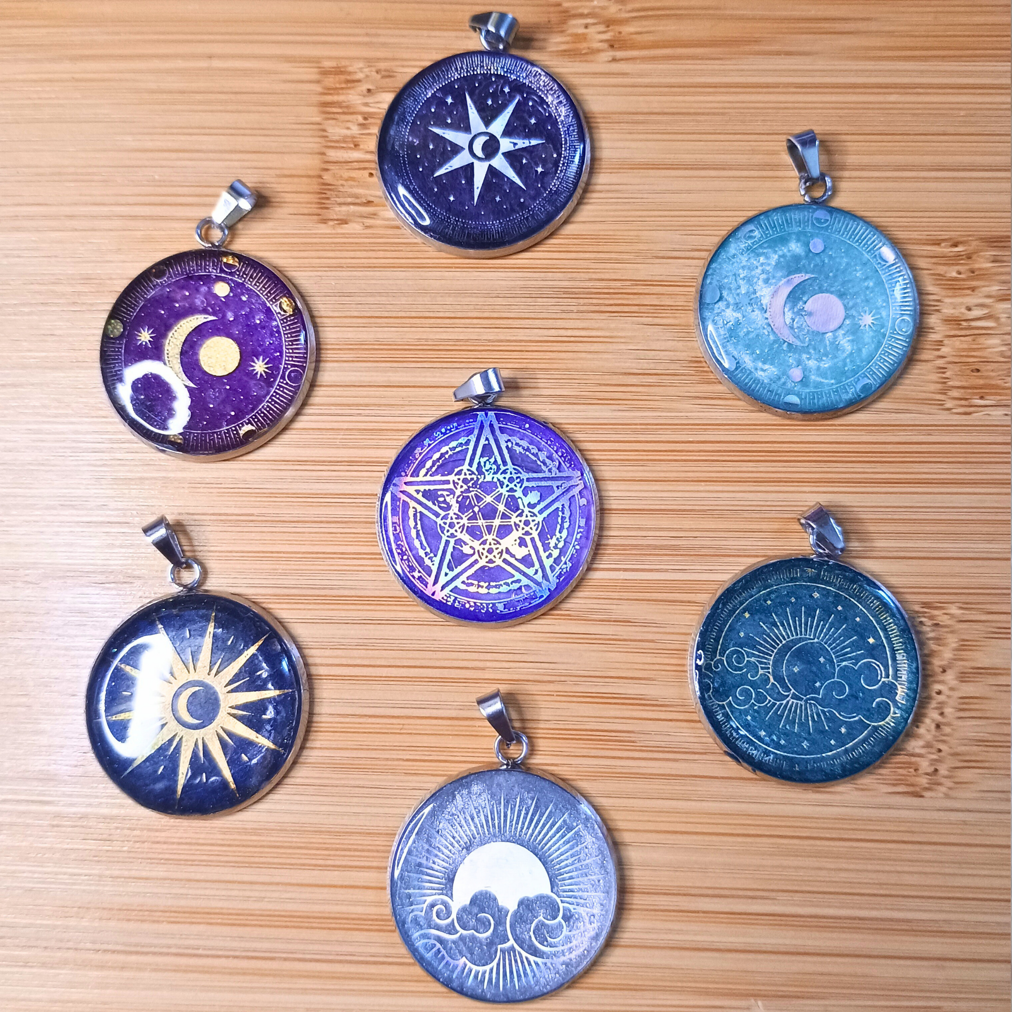 Pendentifs Médailles Acier, Résine, Couleurs et Motifs Astro Les Cartes du Ciel