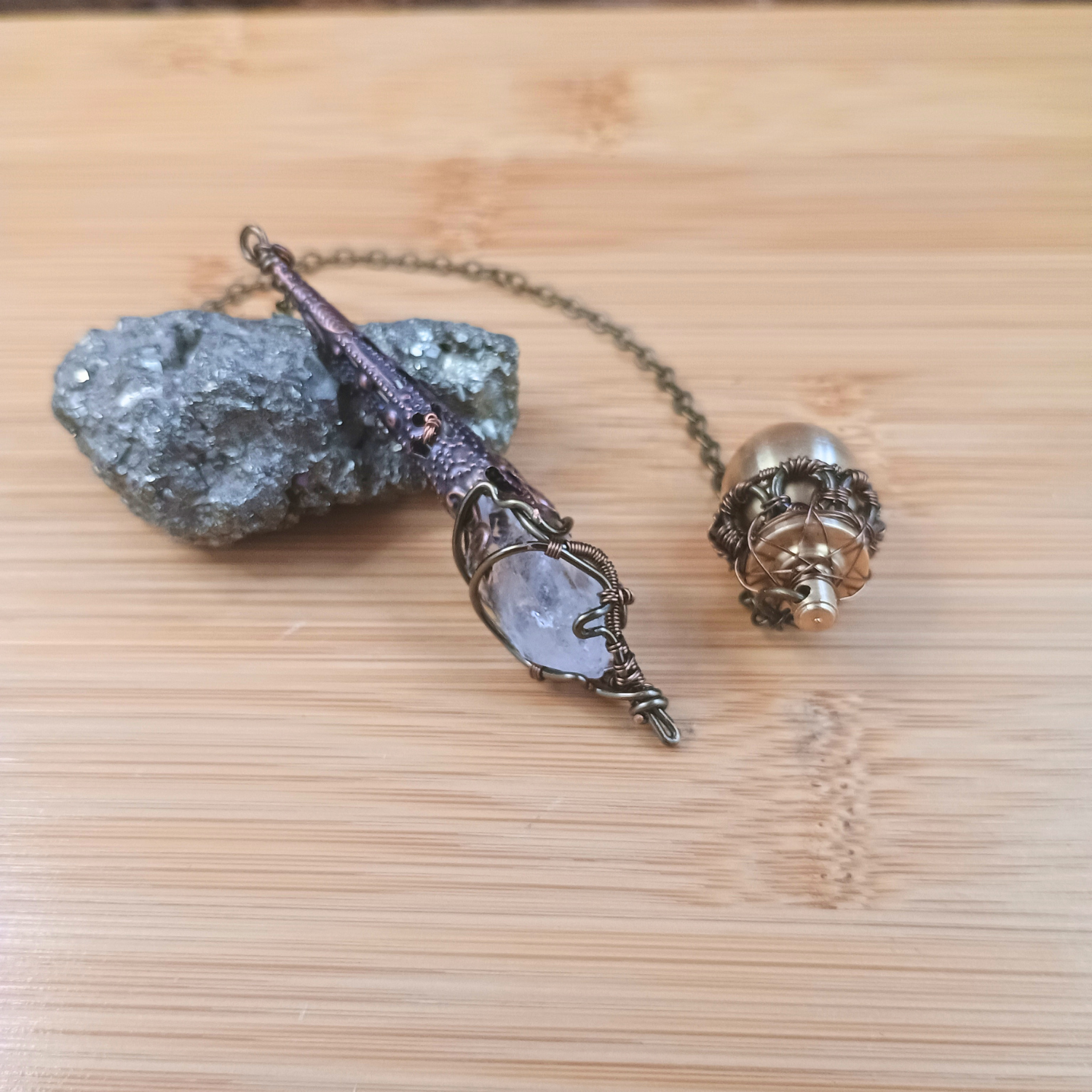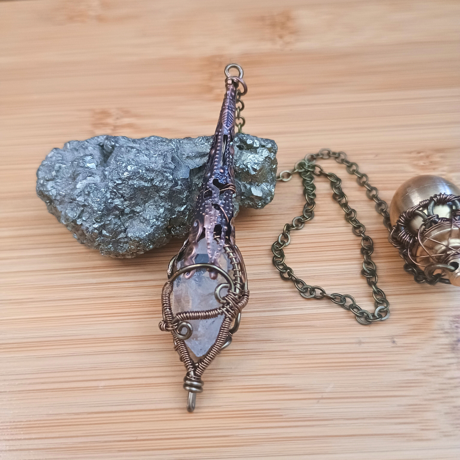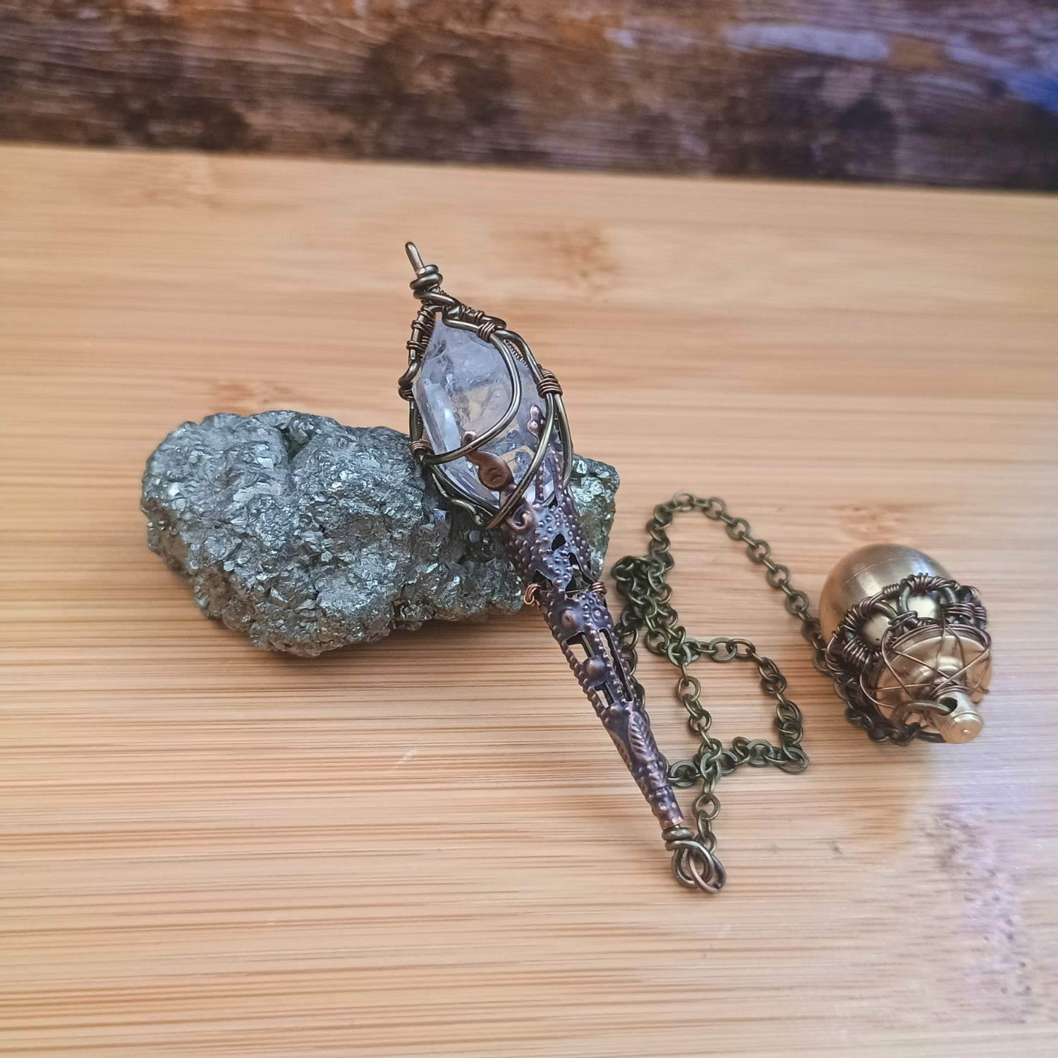 Composition : Pointe cristal de roche, fil de cuivre couleur bronze, chaine/pendule goutte/ornement cône en laiton