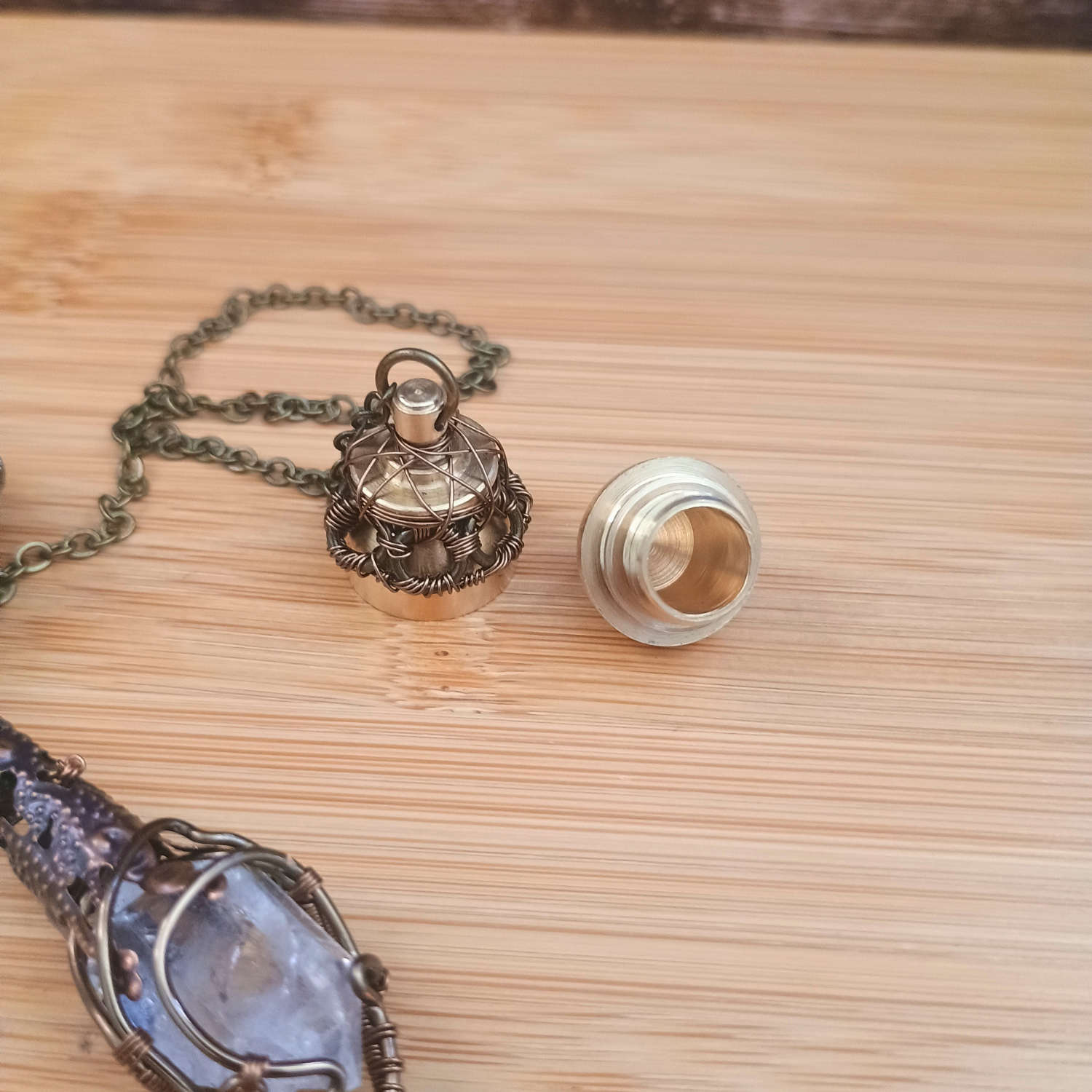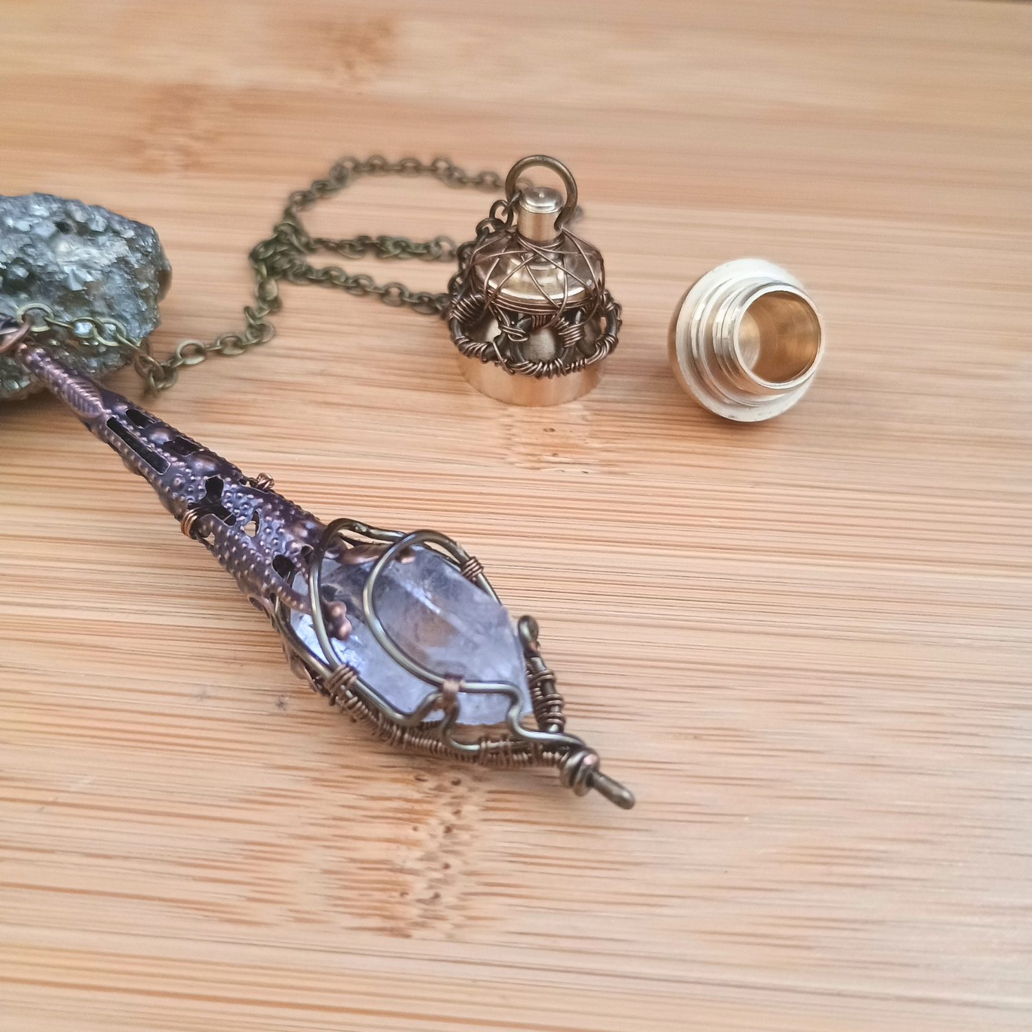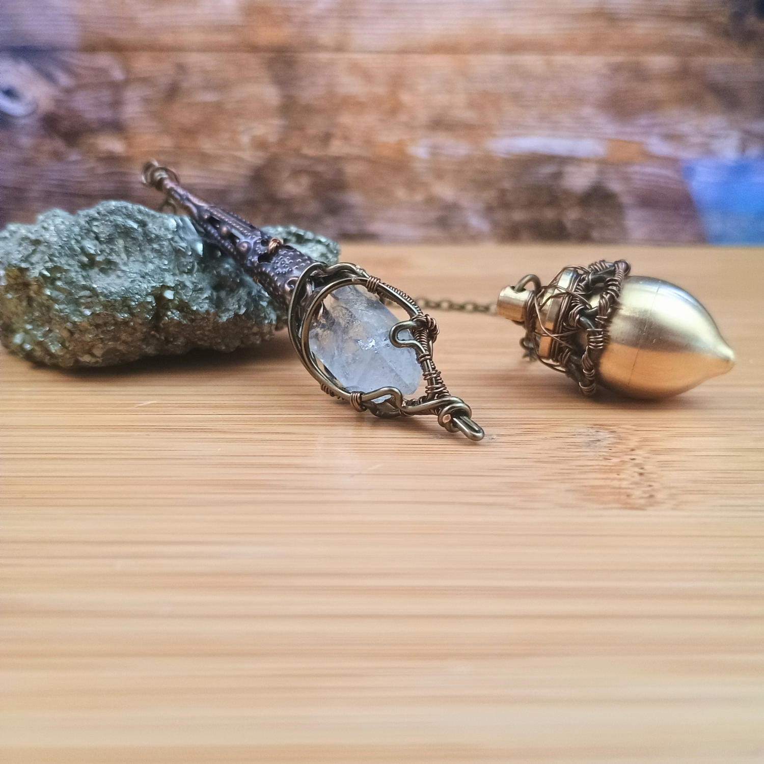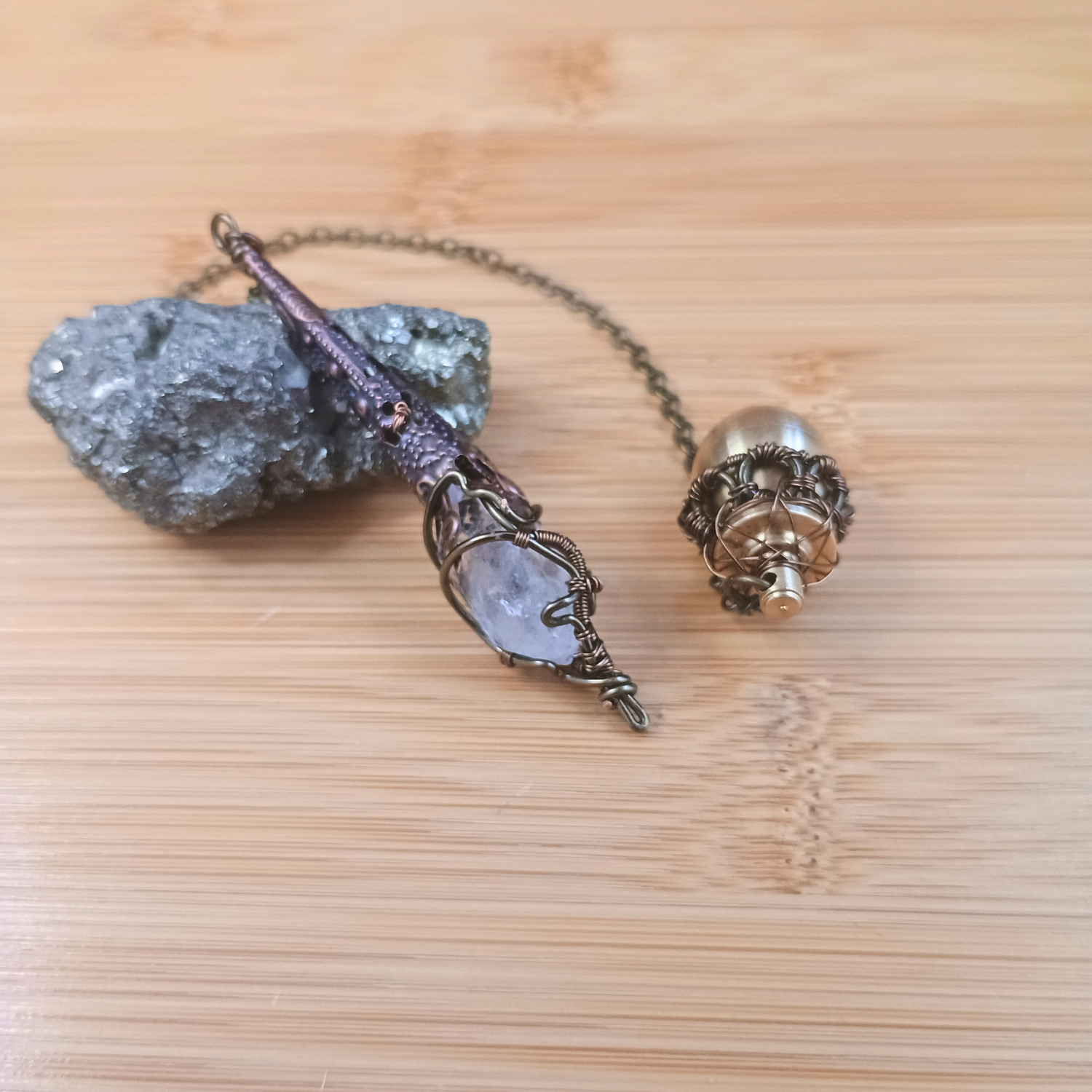 Composition : Pointe cristal de roche, fil de cuivre couleur bronze, chaine/pendule goutte/ornement cône en laiton